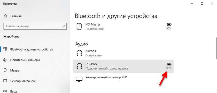 На компьютере уровень заряда батареи можно посмотреть в параметрах Bluetooth.