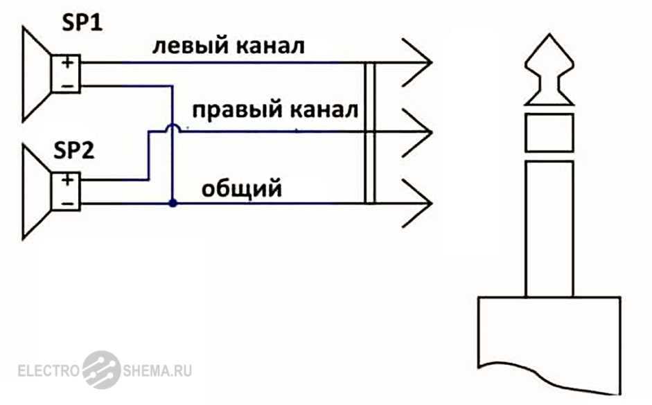 От каждого уха всегда идут два провода — плюс и минус, но иногда производитель объединяет минусы обоих динамиков вместе и получается, что к штекеру приходят всего три провода. Чтобы было понятнее, приведу схему пайки штекера наушников: