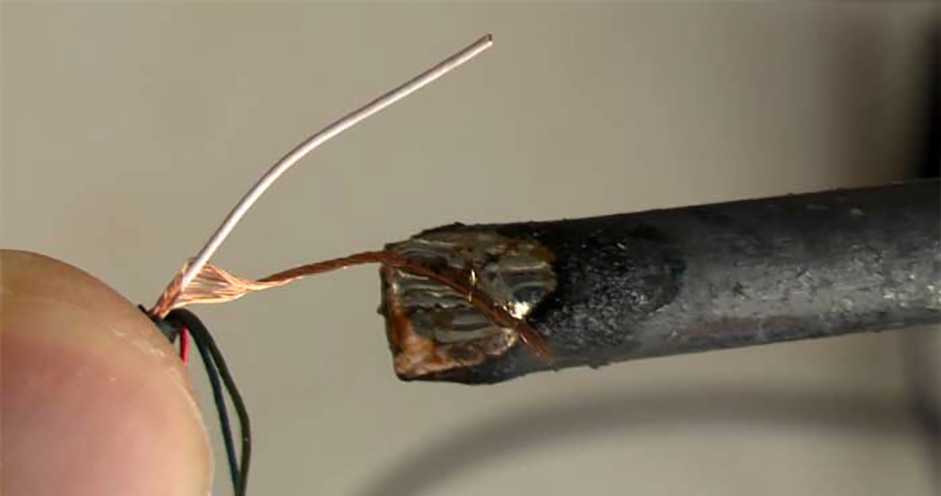 - Разделяем провод на две половины и «заплетаем» косу. Паяльником закрепляем концы, строго посередине.