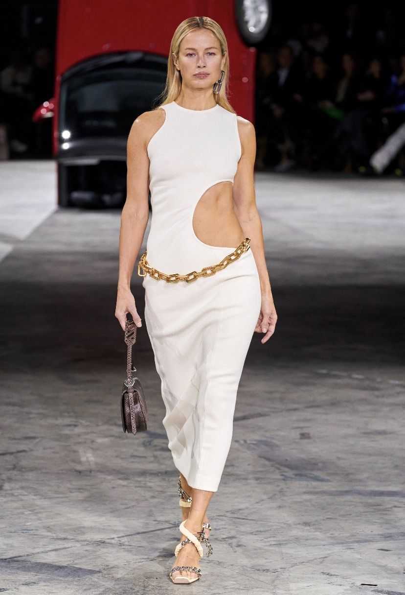 Off-White в этом сезоне предложил идеальное платье для вечеринок и торжественных мероприятий: эффектный вырез на талии идеально сочетается с массивной цепью, расположившейся в области бедер
