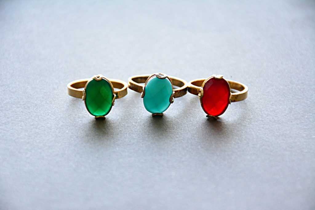 Камни, похожие на карамельки монпансье. Яркие, с неправильной формой. В одном кольце могут сочетаться несколько ярких цветов. Украшения такого типа не сложно найти, однако сложно вписать в стиль. Не на каждой и не с любой вещью они будут сочетаться, но если вы чувствуете, что это ваш стиль, то вперед!