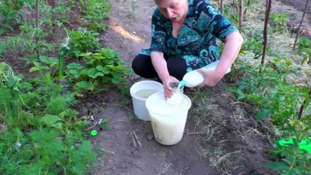Для приготовления корневой подкормки сыворотку следует развести водой комнатной температуры в пропорции 1:10. Поливать полученной смесью культуру нужно под корень и при этом на расстоянии 0,5 метра от него. Если необходимо опрыскать кусты, то концентрация раствора должна быть больше, поэтому кисломолочный продукт следует развести водой. Соотношение компонентов должно оставлять 1:3. Чтобы готовое средство лучше прилипало к листьям, можно в него добавить мыло хозяйственное, заранее натертое на терке.
