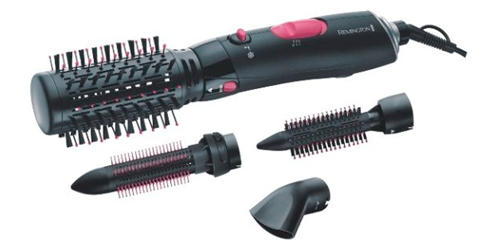 Шестое место занимает Remington AS7051. Внешний вид этой фен-щётки близок к классическому: массивная чёрная ручка и розовые кнопки, притягивающие взгляд. Выглядит стильно, но для путешествия инструмент может не подойти: его вес – около 500 грамм, он довольно громоздкий. Но есть и преимущества, например, специальная кнопка для лёгкого отсоединения насадки. Керамическое покрытие с турмалином равномерно нагревается и защищает волосы от перегрева. Благодаря ему, возможна и ионизация.