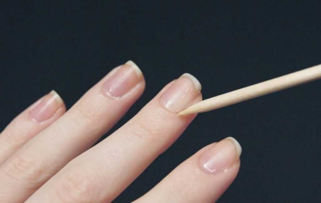 - С помощью апельсиновой палочки аккуратно сдвинь кутикулу к основанию ногтя. Если кожица отходит от ногтя, подцепляй ее палочкой и аккуратно удаляй;