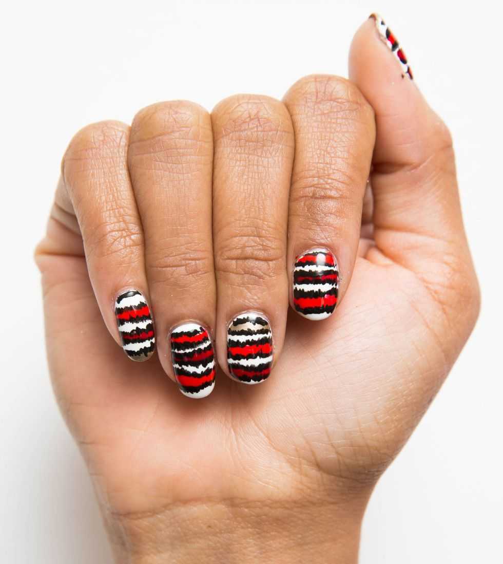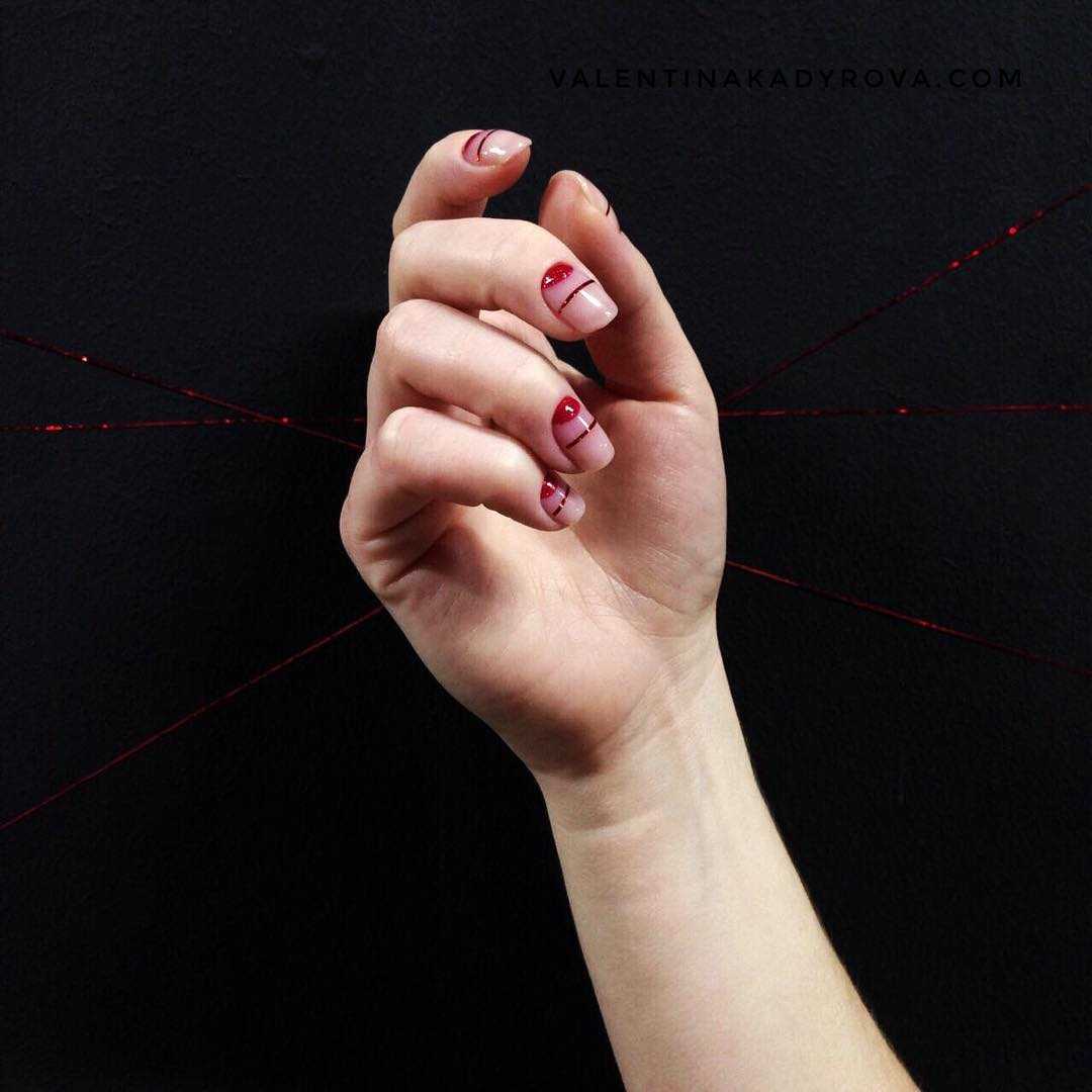 Несмотря на безупречный результат, сделать такой маникюр достаточно просто! Для этого сперва нужно покрыть ноготь базой, после высыхания которой нанести основной цвет. Если лак недостаточно пигментированный, нанести второй слой. Затем взять липкую ленту и порезать ее на небольшие полоски, после чего приклеить на ноготь. Для примера – фото пошагового маникюра с самоклеящимися лентами для дизайна.
