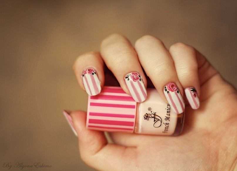 На первый взгляд полосатый маникюр с цветочным узором может показаться несовместимым дизайнерским решением. Но современные женщины не боятся экспериментировать.