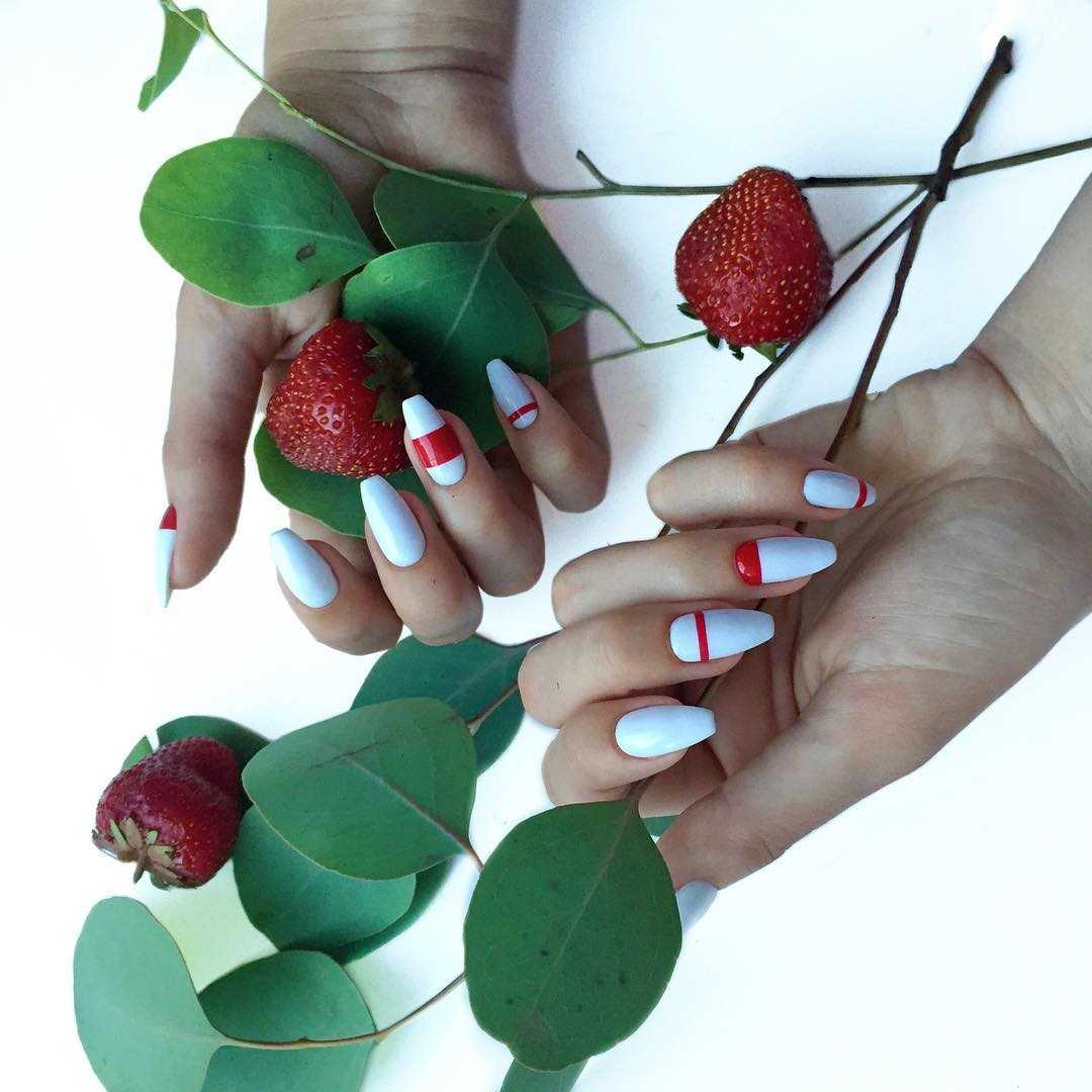 Из форм ногтевой пластины с линиями лучше всего смотрится заостренная. Наклеенные полоски еще больше подчеркнут линии свободного края, пальцы с таким рисунком выглядят длиннее и изящнее. Но если расположить полоски вертикально, можно удлинить и овальные ногти.