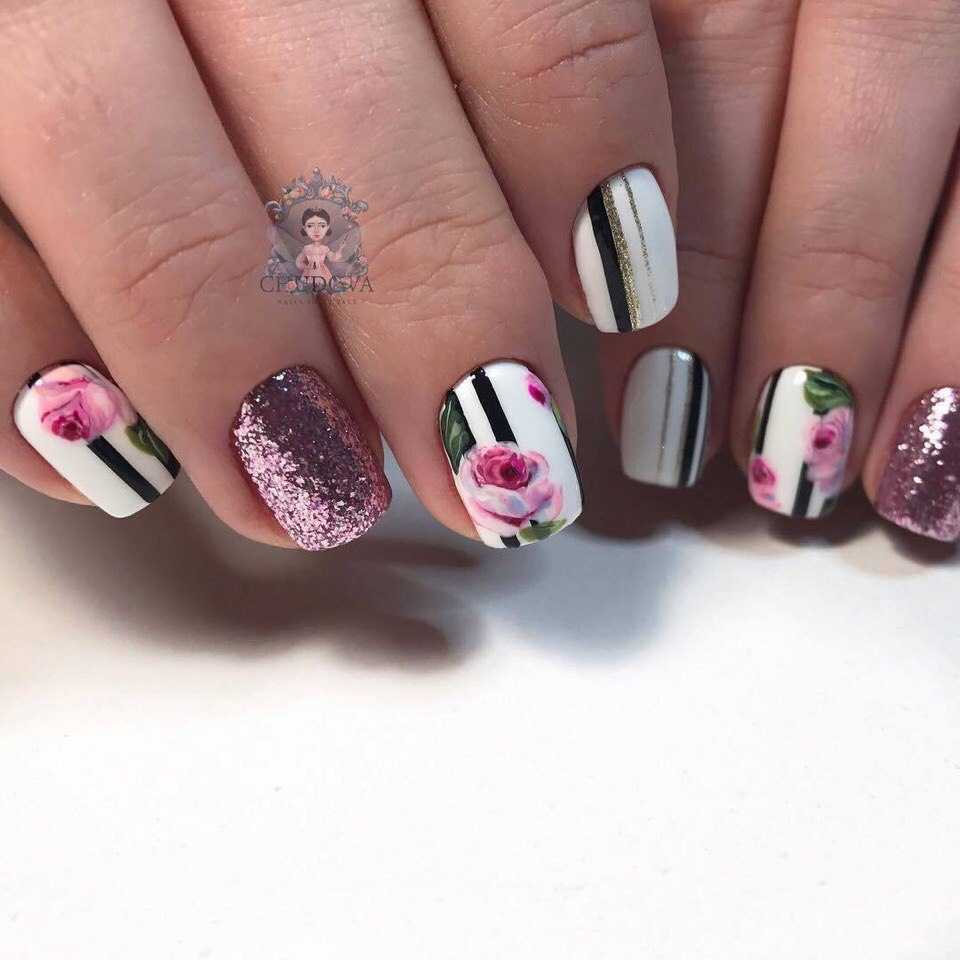 Полосатый маникюр в сочетании с насыщенным и ярким цветочным узором выглядит невероятно привлекательно и красиво. Маникюр в полоску, в который добавлен цветочный узор, добавит образу нежности, романтичности и некой легкости.