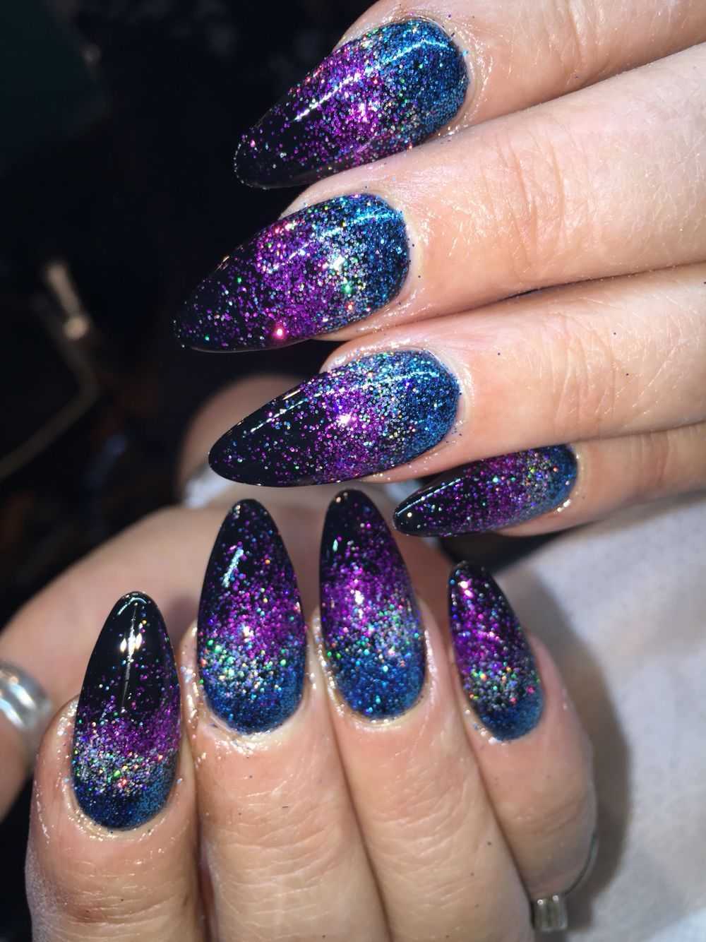 Космический дизайн с блестками отлично подойдет для торжественных случаев, для его выполнения не обязательно обращаться к профессионалам. Покрыть ноготь полностью или изобразить с помощью блесток звездную пыль — вариант найдется для каждой.