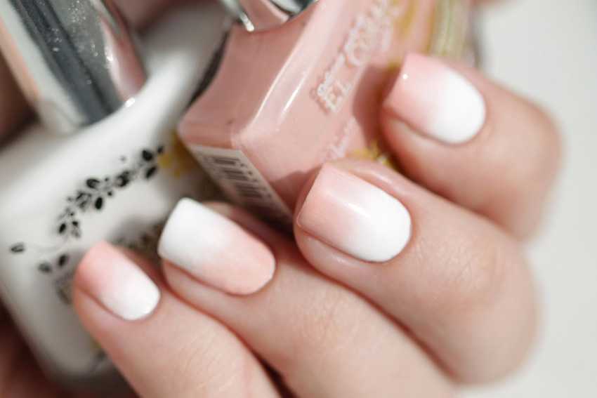 Очень эффектным получается градиентный французский маникюр губкой с лаками розовым и белым. Более экстравагантный вариант – обратный французский маникюр в той же технике.