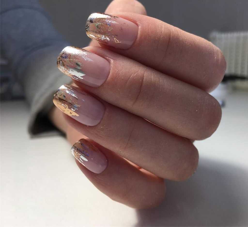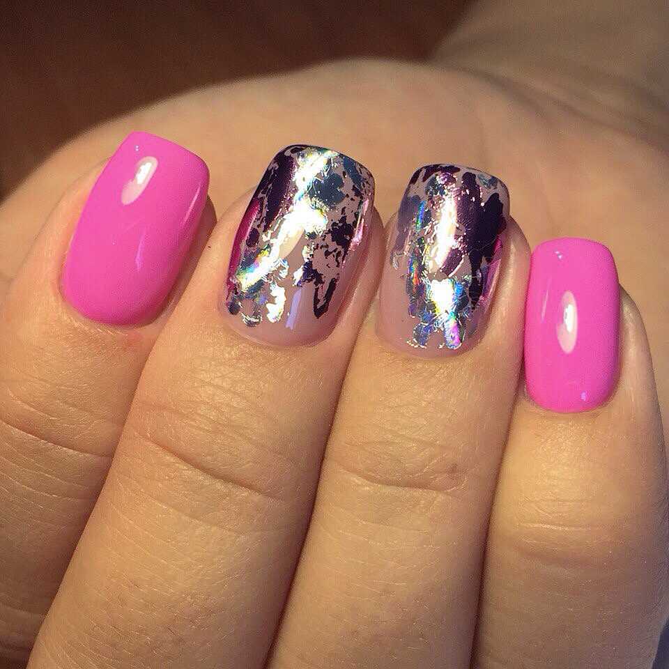 На коротких ногтях идеально сделать маникюр с фольгой. Это придаст необычный, интересный, стильный вид, наполняя ногти светом и переливами. Никакие дизайны маникюра не имеют такого сногсшибательного эффекта, как эффект фольги, который сочетается практически с любым оттенком основного лака. Фольгу можно применять как украшение для праздничного дизайна и на повседневном маникюре.