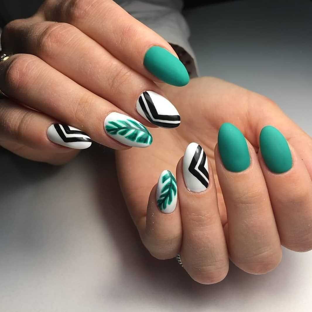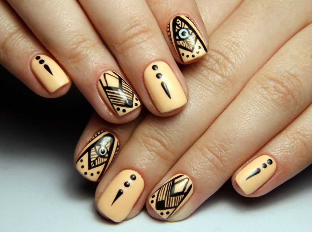 Цветной маникюр с геометрией – это хороший вариант летнего маникюра. Здесь могут быть яркие и сочные цвета лака, разнообразная геометрия, миксуются матовые и глянцевые покрытия, добавляется шиммер, фольга и песок. В большинстве случаев геометрия делается не на всех пальцах, а на одном и двух пальцах руки. Часто в качестве узора выступают сложные этнические орнаменты, сплетение геометрических фигур.