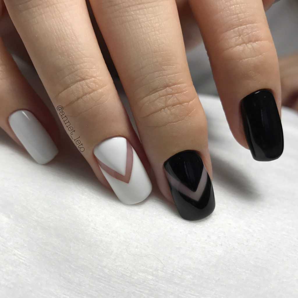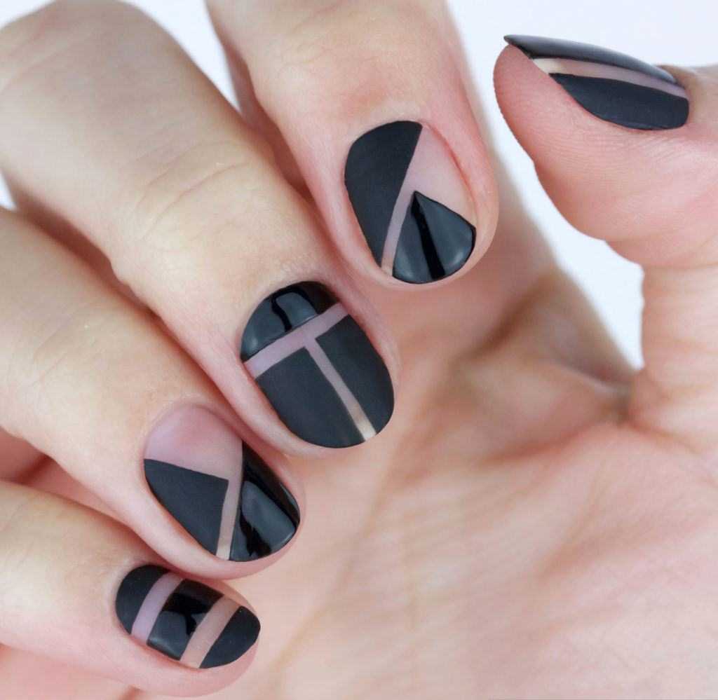 Например, сделать необычный жакет, в котором все его «улыбки» будут иметь разные очертания, в виде «мяты», традиционно округлой или геометрически угловатой. Комбинируя маникюр с геометрией и лунным дизайном, можно выделить лунки и кончики ногтей по диагонали, остальную часть ногтевой области покрасить нейтральным или прозрачным лаком и нанести пару тонких пересекающихся полосок «паутиной». «черный сверху. Особенно волшебно они смотрятся там, где геометрические композиции выполнены из кристаллов пикси, страз или кусочков фольги. За счет блеска и игры красок этих элементов он выглядит как сказочная мозаика или блестит на ногтях витраж.