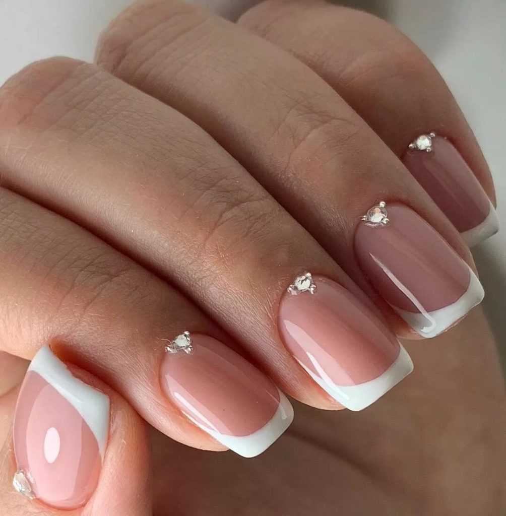 Как никогда будет актуален двойной лунный маникюр, можно сделать очертания лунки с помощью стразов, предварительно нарисовав полоску цветным лаком или оставив прозрачную полоску.