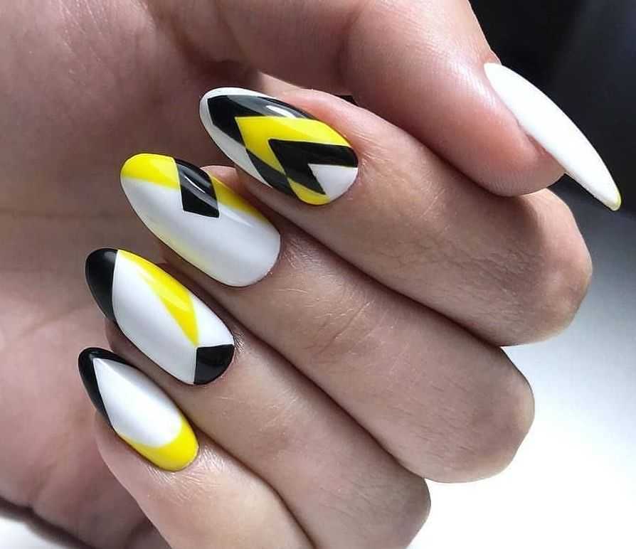 В текущем сезоне наиболее актуальны длинные миндальные ногти. Острые очертания такой формы подчеркнут лаконичность и женственность простого дизайна и сгладят пестроту сложного. На длинной длине можно экспериментировать с сочетанием контрастных цветов и фактур, сочетать в одном маникюре разные дизайны. При этом за основу стоит выбрать нейтральные цвета, чтобы яркие и динамичные геометрические узоры ярче выделялись на фоне.