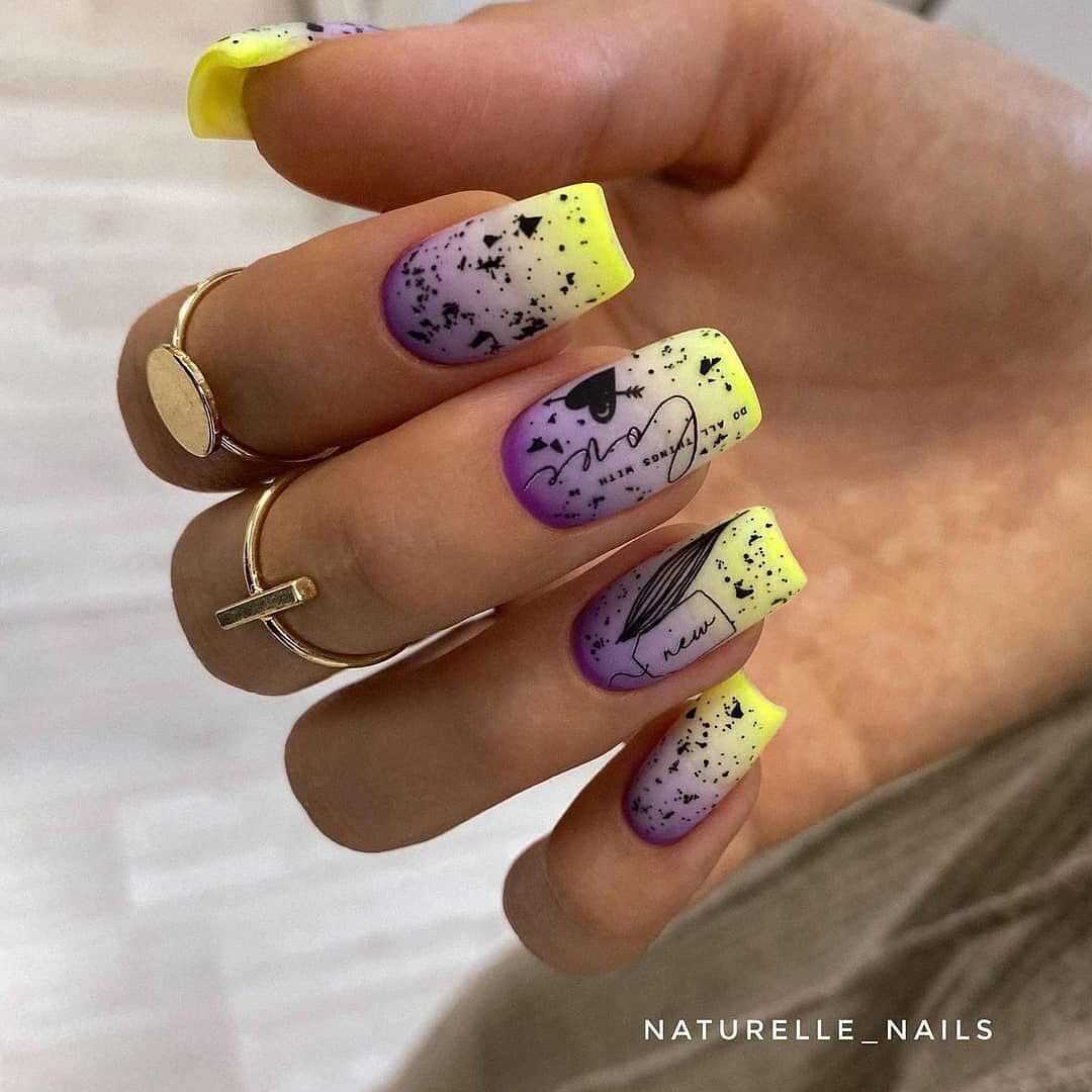 Фиолетовый в сочетании с желтым образует яркий, сочный дизайн. Но помните, что желтый, такой же самодостаточный оттенок, как и фиолетовый, поэтому вводите его в маникюр постепенно, дабы декор не выглядел наляписто.
