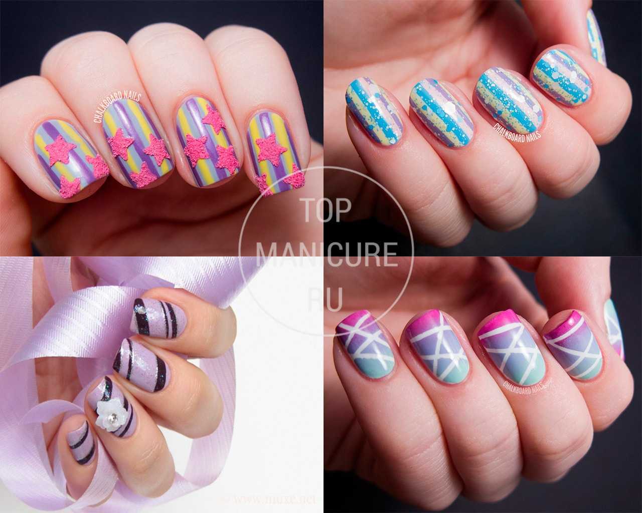 На фото 1 мы видим желто-сиреневый маникюр со звездами. В этом случае линии рисуются на ногтях сиреневым, желтым и фиолетовым лаками. Чтобы сделать звезды, нужно навырезать из липкой бумажной ленты звездочек и покрыть их лаком с блестками. Если у вас есть фигурный дырокол, нарезать звезды будет гораздо проще. Останется только наклеить их на ногти и маникюр готов.