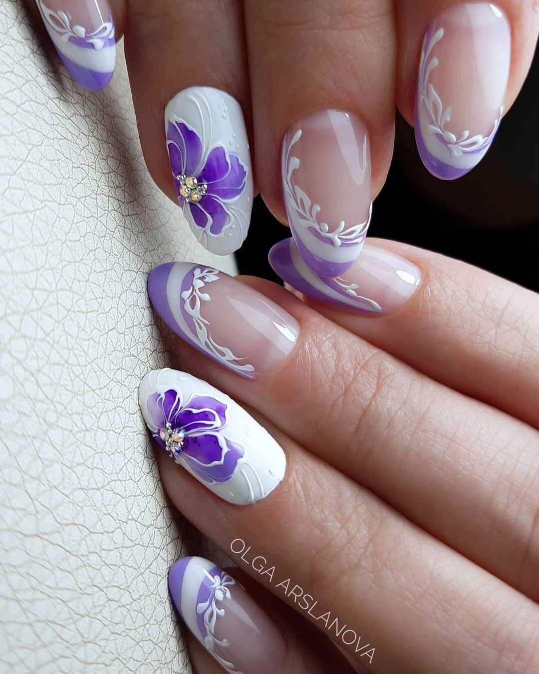 Это предложение станет идеальным выбором для тех, кто ещё не раскрыл для себя особенности сиреневого оттенка или считает однотонное покрытие слишком «приторным». Покройте нейтральным белым несколько ногтевых пластин и дополните их парой блестящих кристаллов или модными слайдерами. Таким образом вы измените используемую ранее концепцию и освежите ноготки.