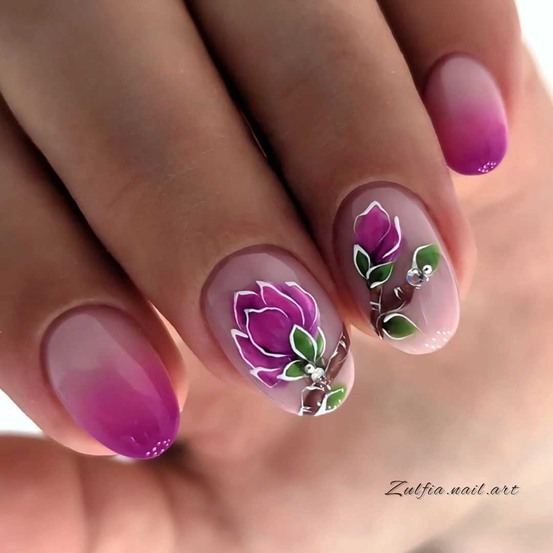 Поскольку цветы нравятся абсолютно всем женщинам без исключения, даже если речь идёт о колючих кактусах или невзрачных на первый взгляд незабудках, нейл-мастера постоянно усовершенствуют свои художественные навыки и украшают женские ноготки всевозможными веточками, соцветиями, нераскрывшимися бутонами и целыми клумбами. Такой маникюр смотрится невероятно женственно и дополнит любой образ романтичными нотками.