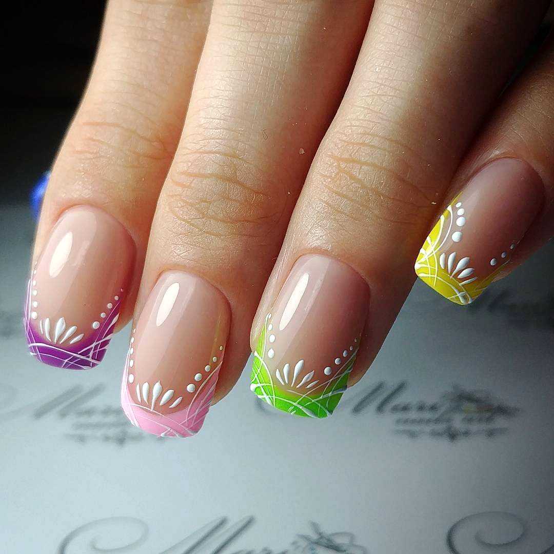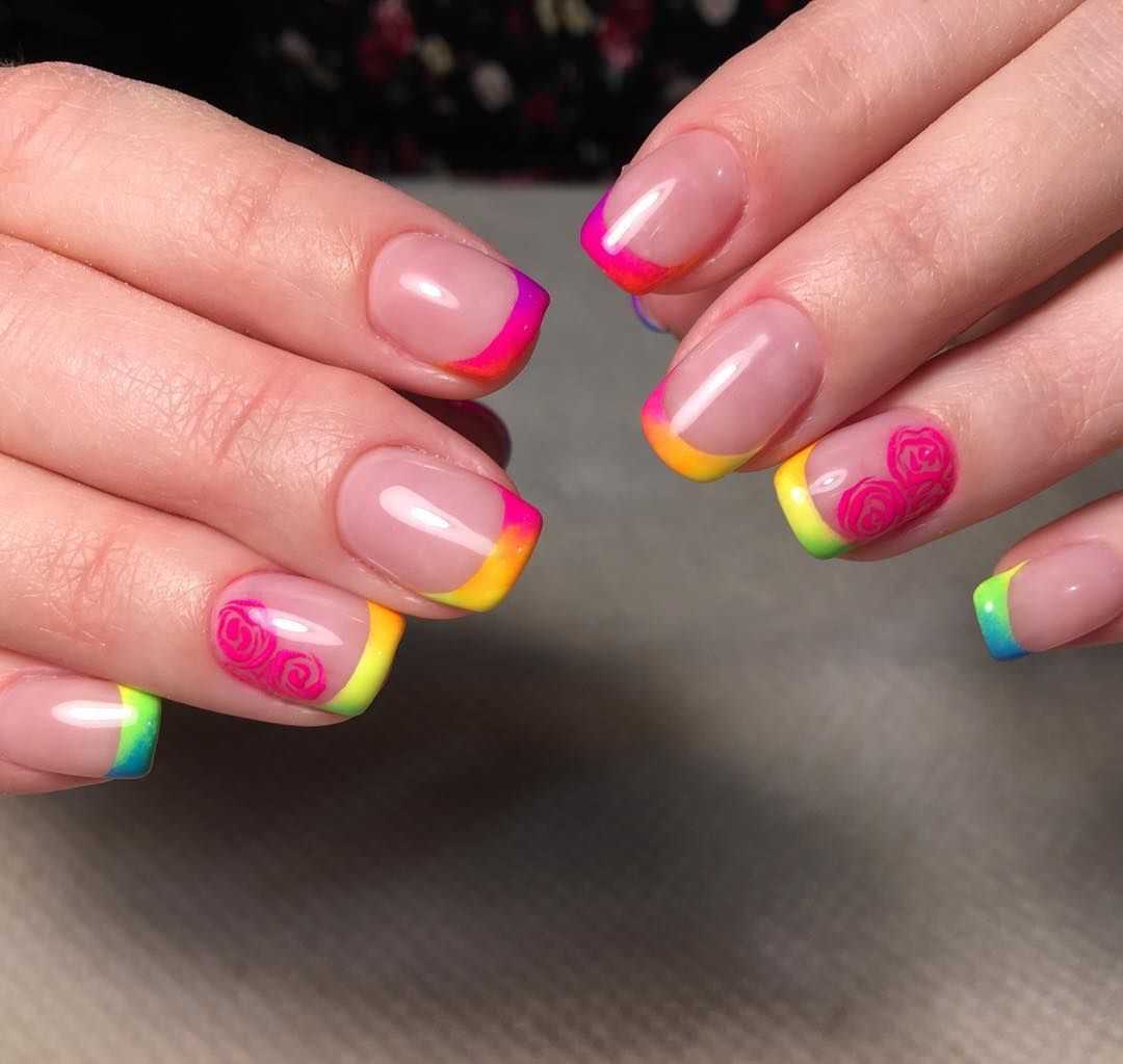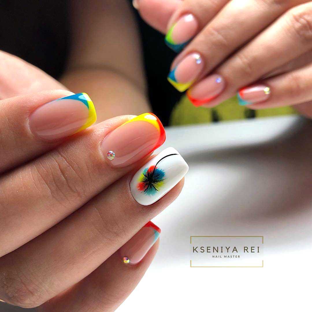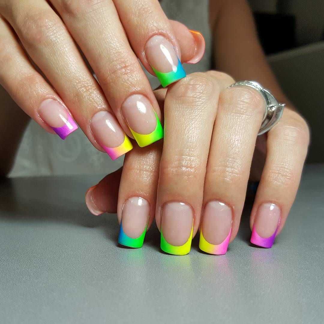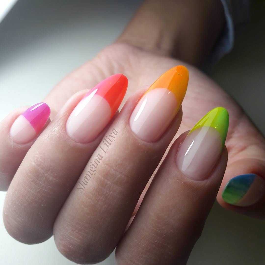 Разные оттенки используются для прорисовки «улыбки» френча или заполняют все пространство ногтевой пластины. Для френча чаще всего используют яркие оттенки с переходом цвета в пределах одного ногтя или по всей руке. Если вы решили прокрасить «улыбку» всеми цветами радуги, то остальное пространство ногтя лучше оставить не окрашенной либо покрыть его белым гель-лаком. Акцент в этом дизайне должен быть только один и это разноцветная линия «улыбки».