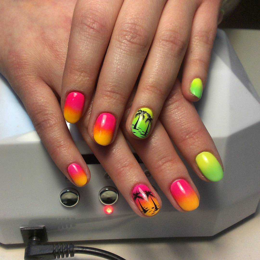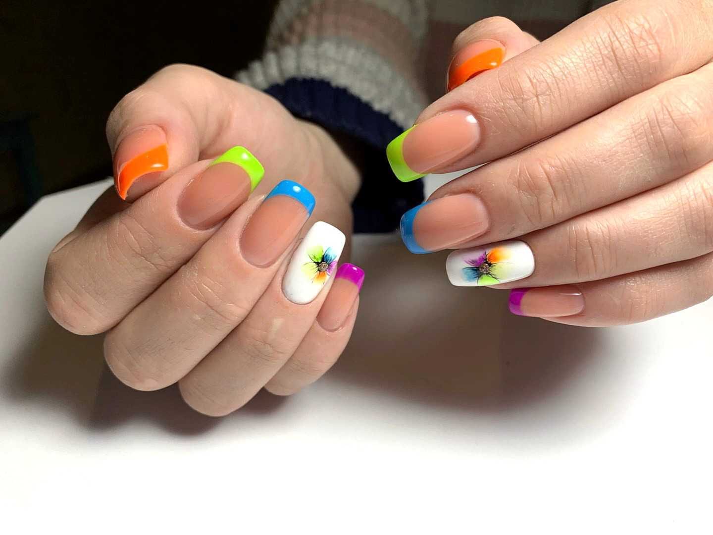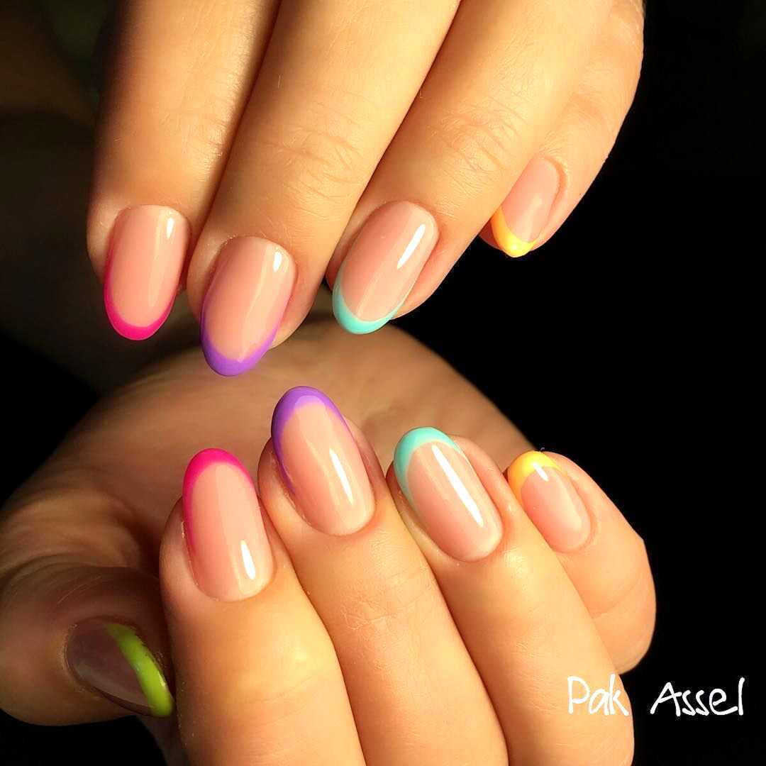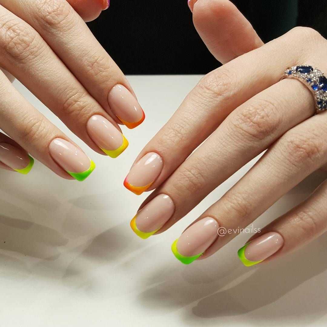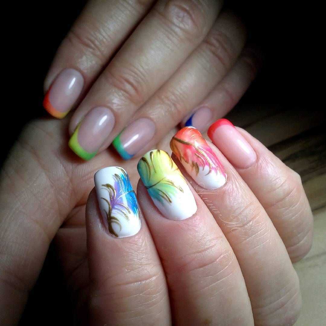 Разные оттенки используются для прорисовки «улыбки» френча или заполняют все пространство ногтевой пластины. Для френча чаще всего используют яркие оттенки с переходом цвета в пределах одного ногтя или по всей руке. Если вы решили прокрасить «улыбку» всеми цветами радуги, то остальное пространство ногтя лучше оставить не окрашенной либо покрыть его белым гель-лаком. Акцент в этом дизайне должен быть только один и это разноцветная линия «улыбки».