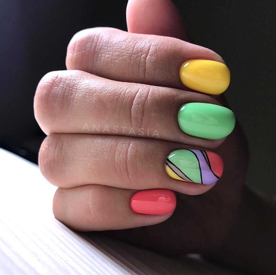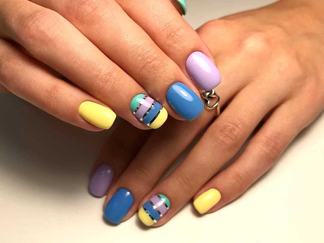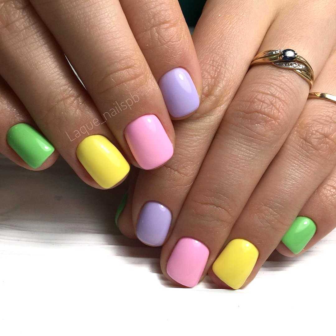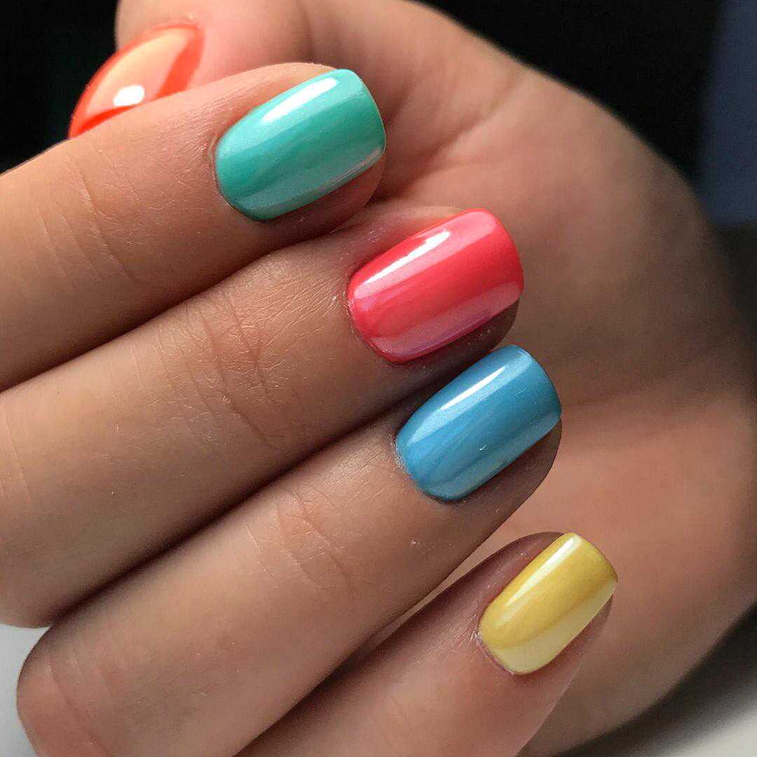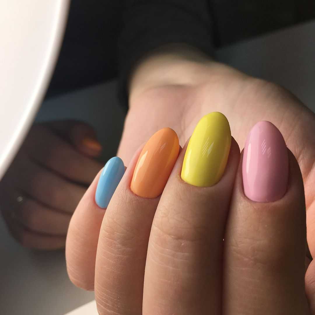 Разноцветный маникюр стал очень популярным благодаря своей универсальности. Любая модница без труда подберет аксессуары и одежду к таким ногтям. В грамотном исполнении такой маникюр легко впишется в самый строгий дресс-код или смело подчеркнет ваше светлое настроение в любую погоду. Спешим выбирать оттенки!