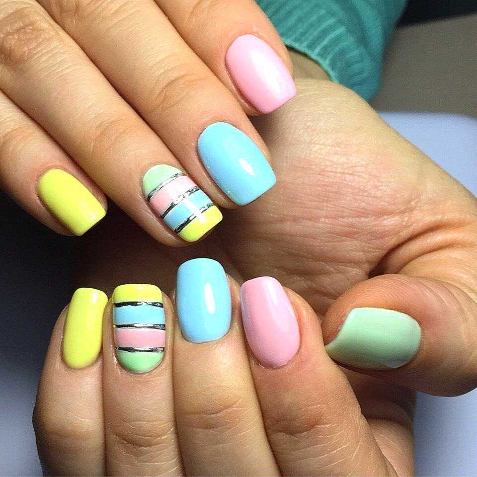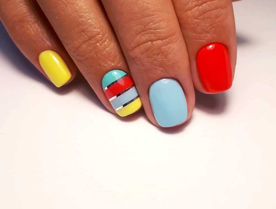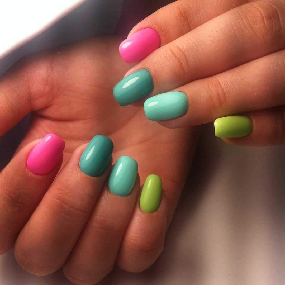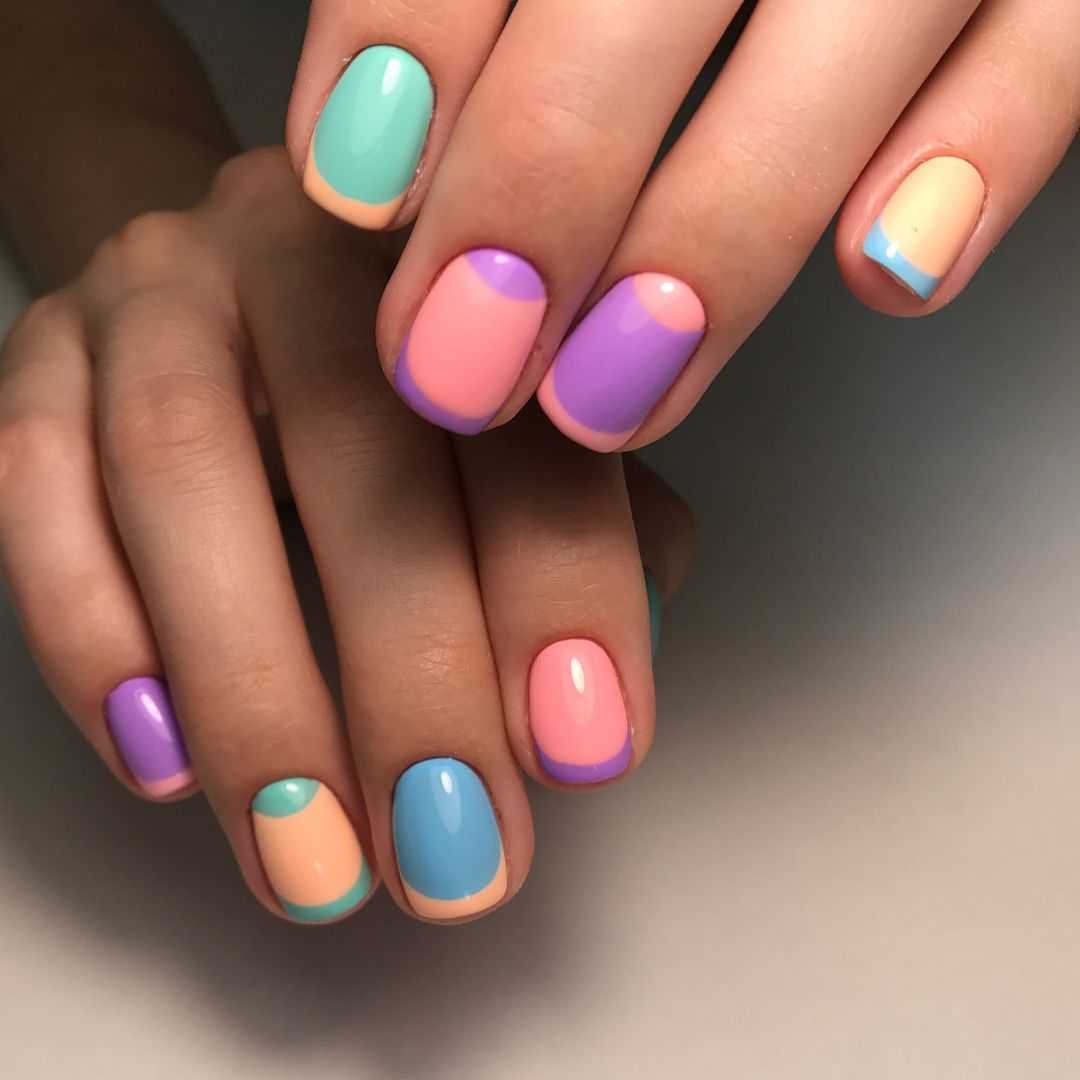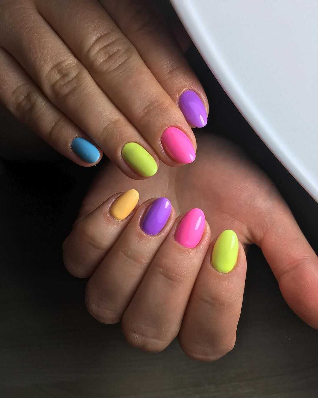 Разноцветный маникюр стал очень популярным благодаря своей универсальности. Любая модница без труда подберет аксессуары и одежду к таким ногтям. В грамотном исполнении такой маникюр легко впишется в самый строгий дресс-код или смело подчеркнет ваше светлое настроение в любую погоду. Спешим выбирать оттенки!