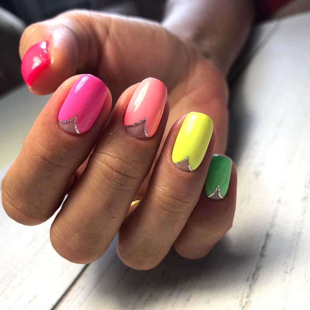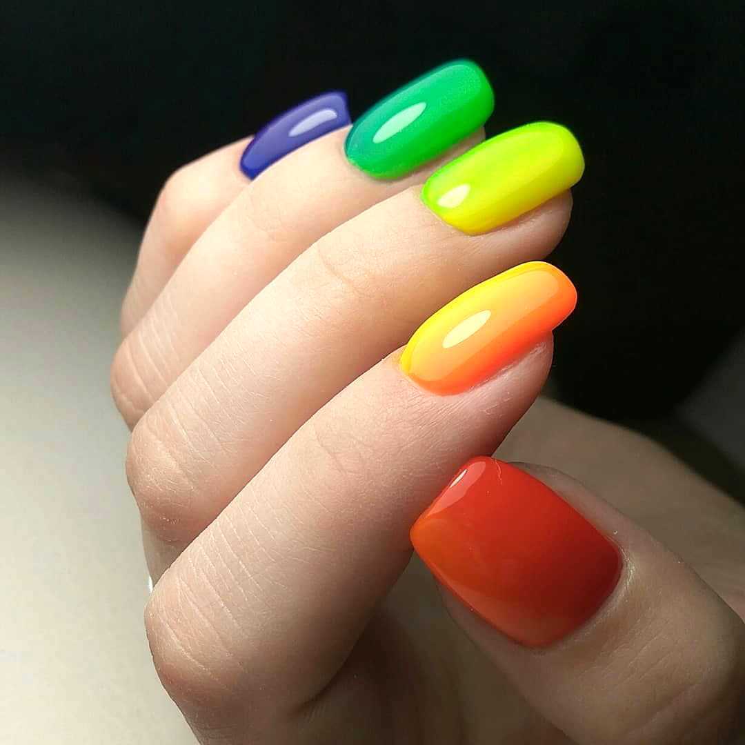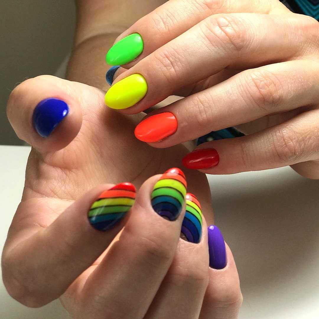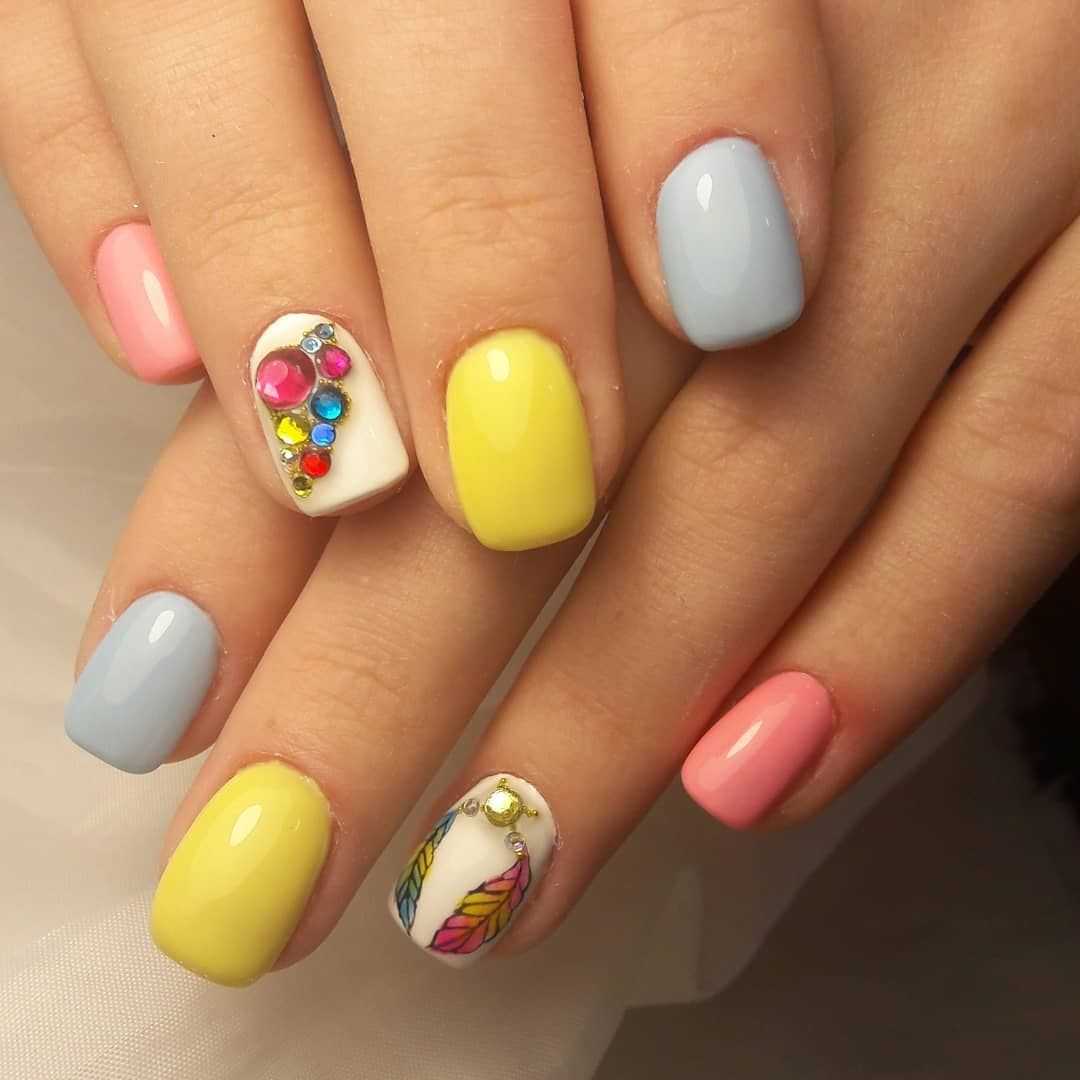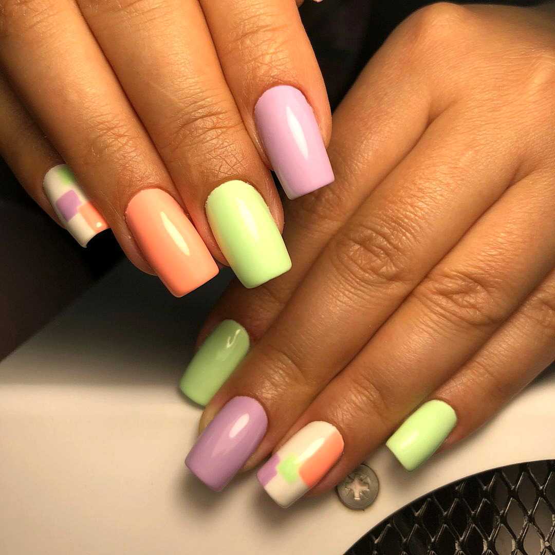 Разноцветный маникюр стал очень популярным благодаря своей универсальности. Любая модница без труда подберет аксессуары и одежду к таким ногтям. В грамотном исполнении такой маникюр легко впишется в самый строгий дресс-код или смело подчеркнет ваше светлое настроение в любую погоду. Спешим выбирать оттенки!