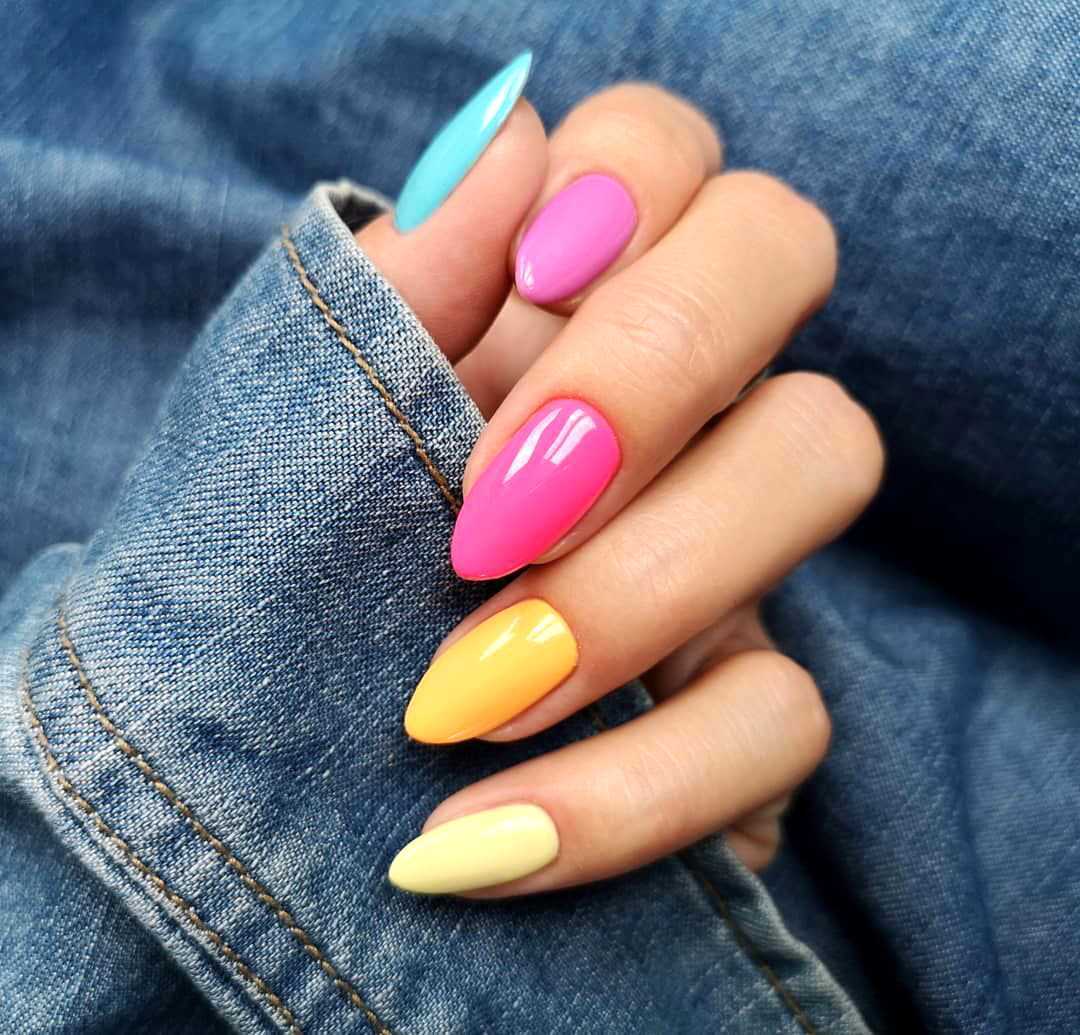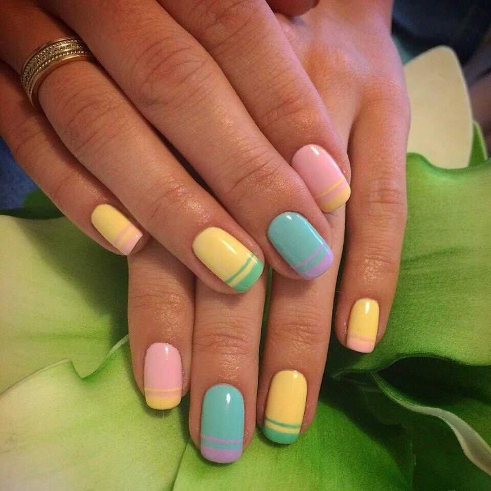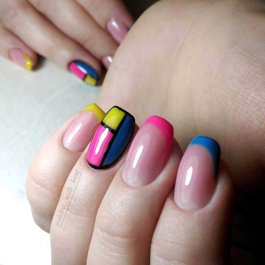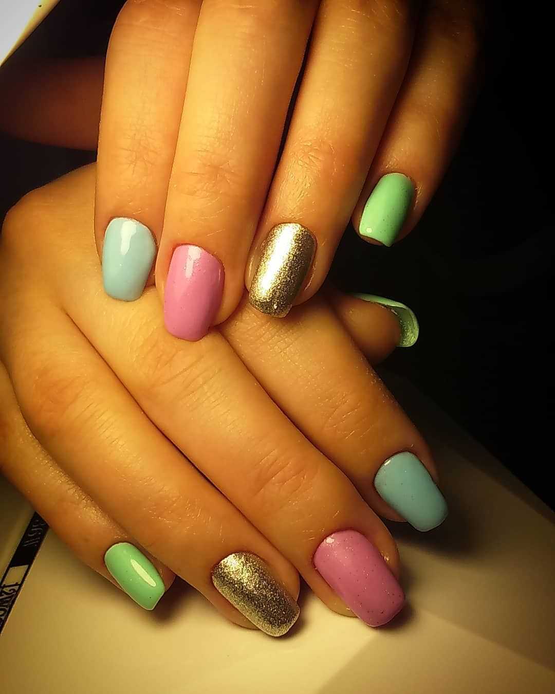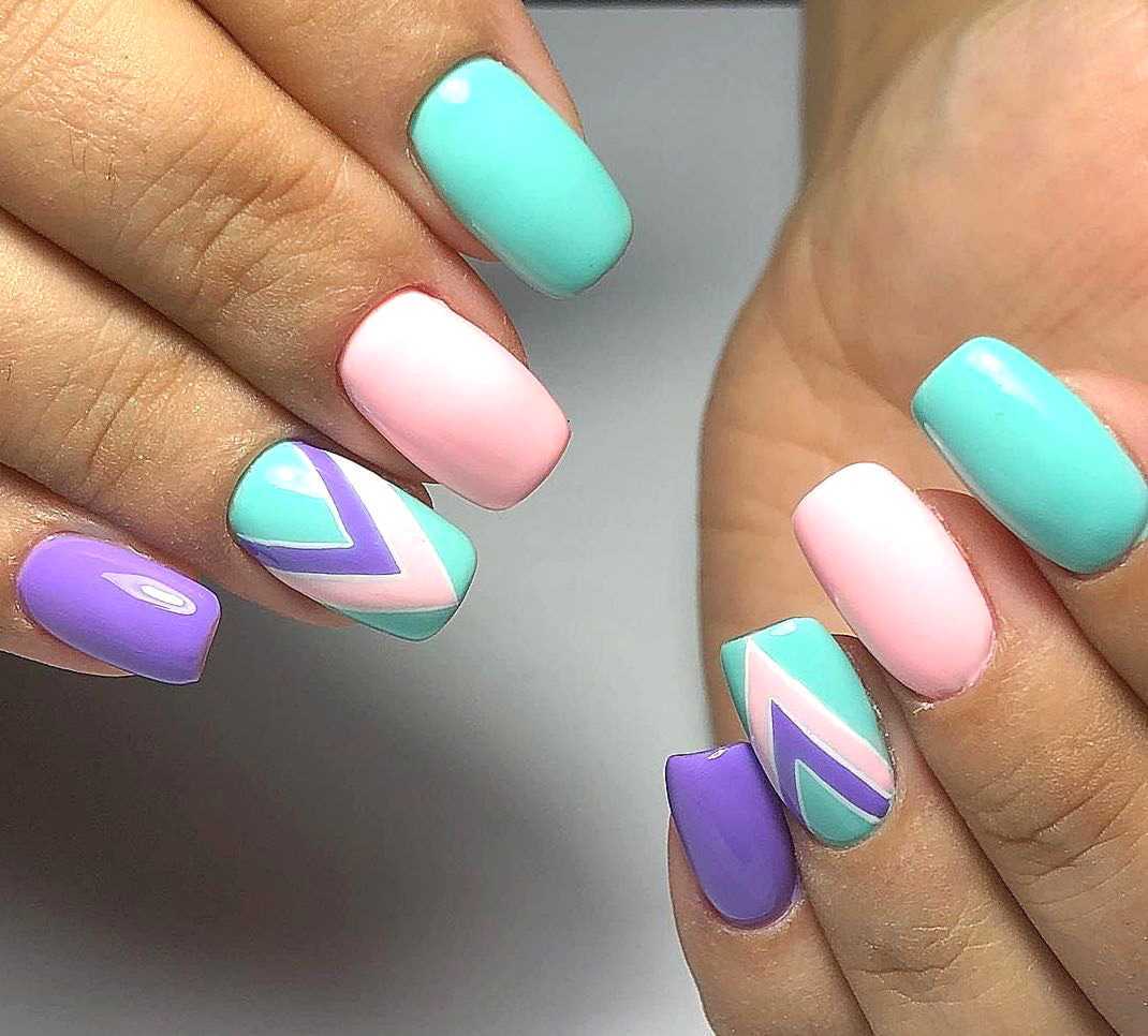 Разноцветный маникюр стал очень популярным благодаря своей универсальности. Любая модница без труда подберет аксессуары и одежду к таким ногтям. В грамотном исполнении такой маникюр легко впишется в самый строгий дресс-код или смело подчеркнет ваше светлое настроение в любую погоду. Спешим выбирать оттенки!