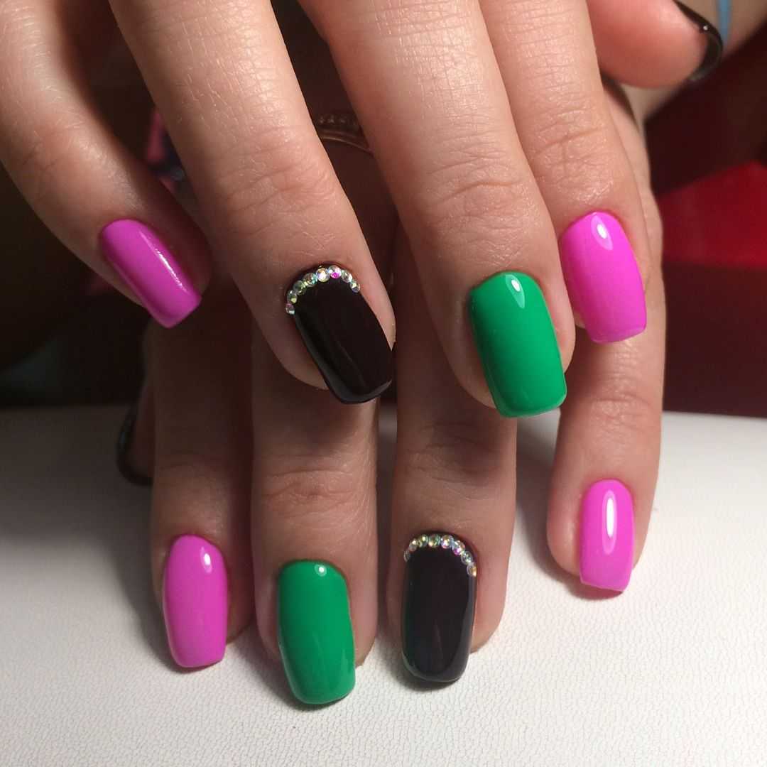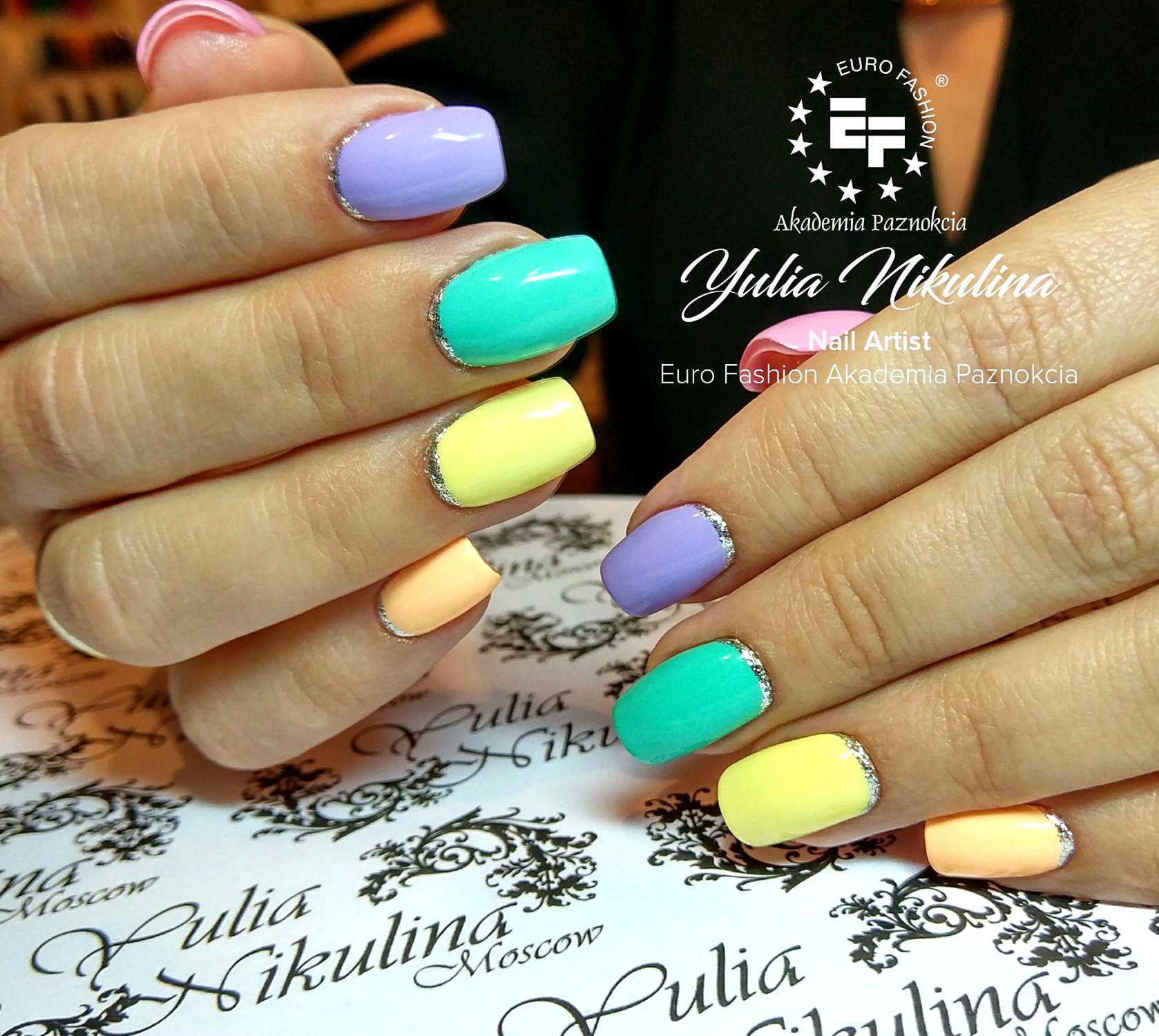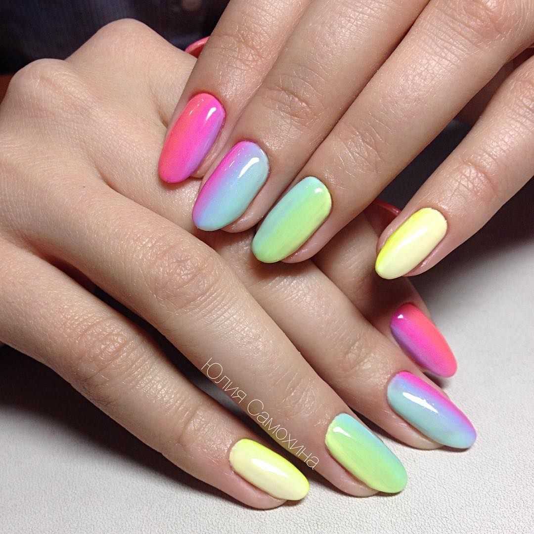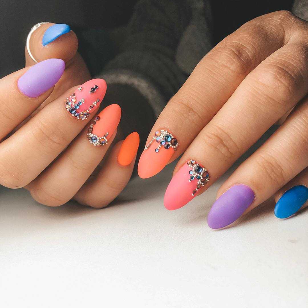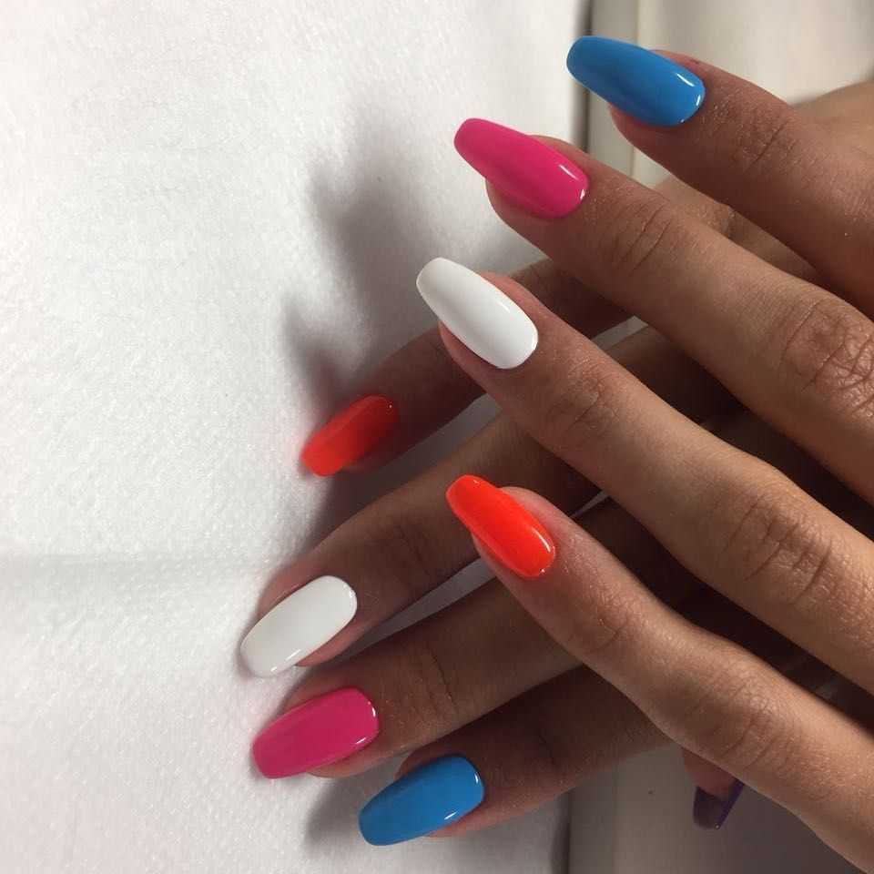 Разноцветный маникюр стал очень популярным благодаря своей универсальности. Любая модница без труда подберет аксессуары и одежду к таким ногтям. В грамотном исполнении такой маникюр легко впишется в самый строгий дресс-код или смело подчеркнет ваше светлое настроение в любую погоду. Спешим выбирать оттенки!