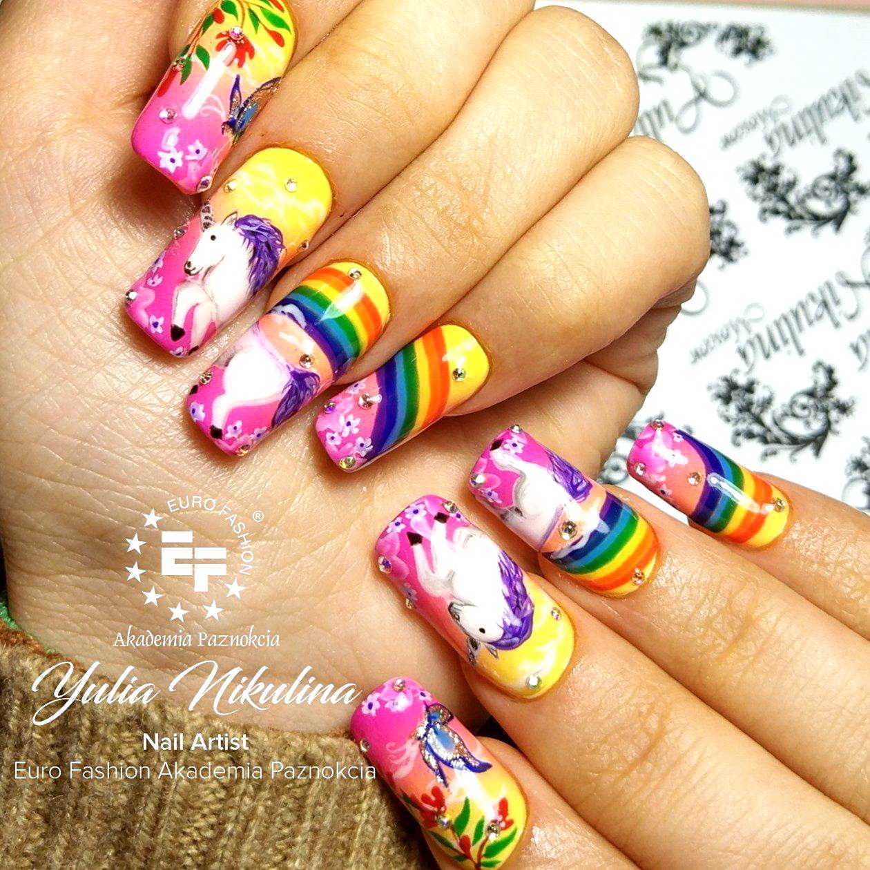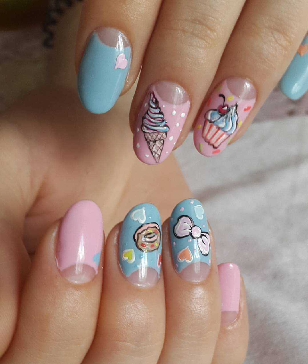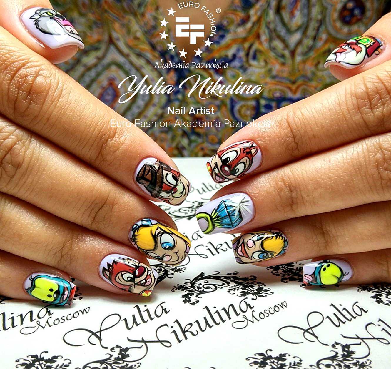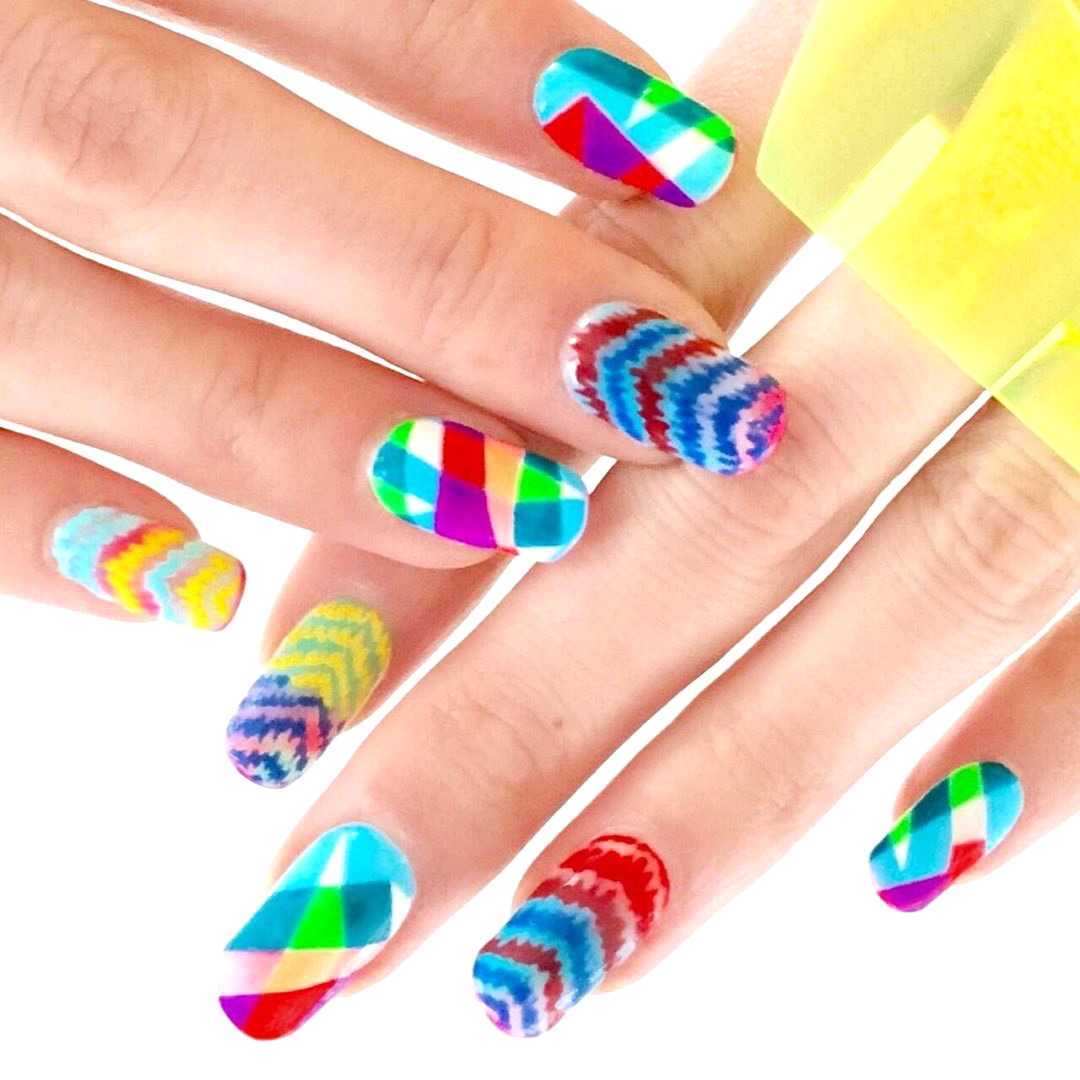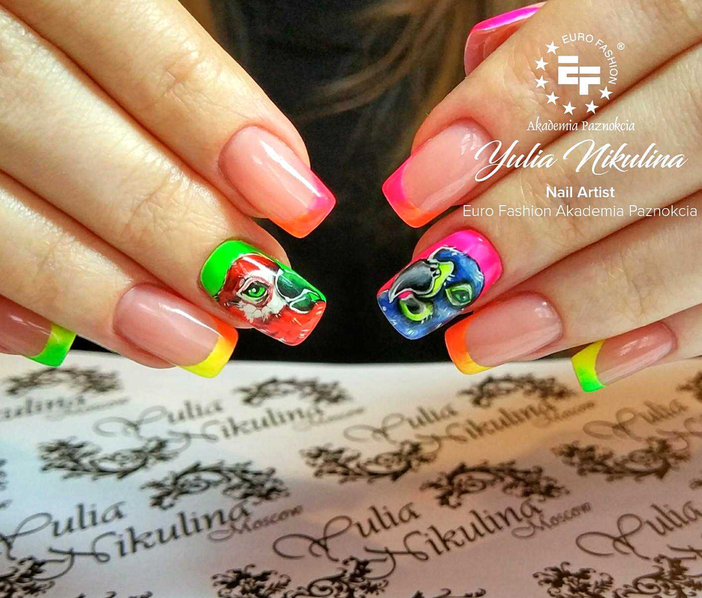 Одним из последних трендов является маникюр в стиле поп-арт. Он идеально подходит для создания маникюра на разные руки. Абстракции, логотипы известных брендов, рисунки губ, стилизации под детские рисунки пользуются неизменным спросом.