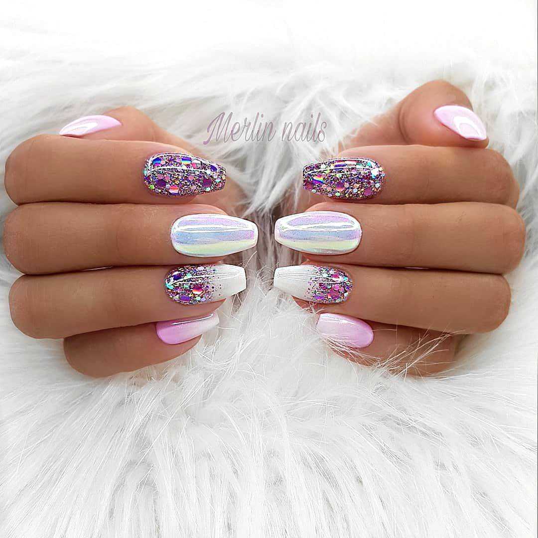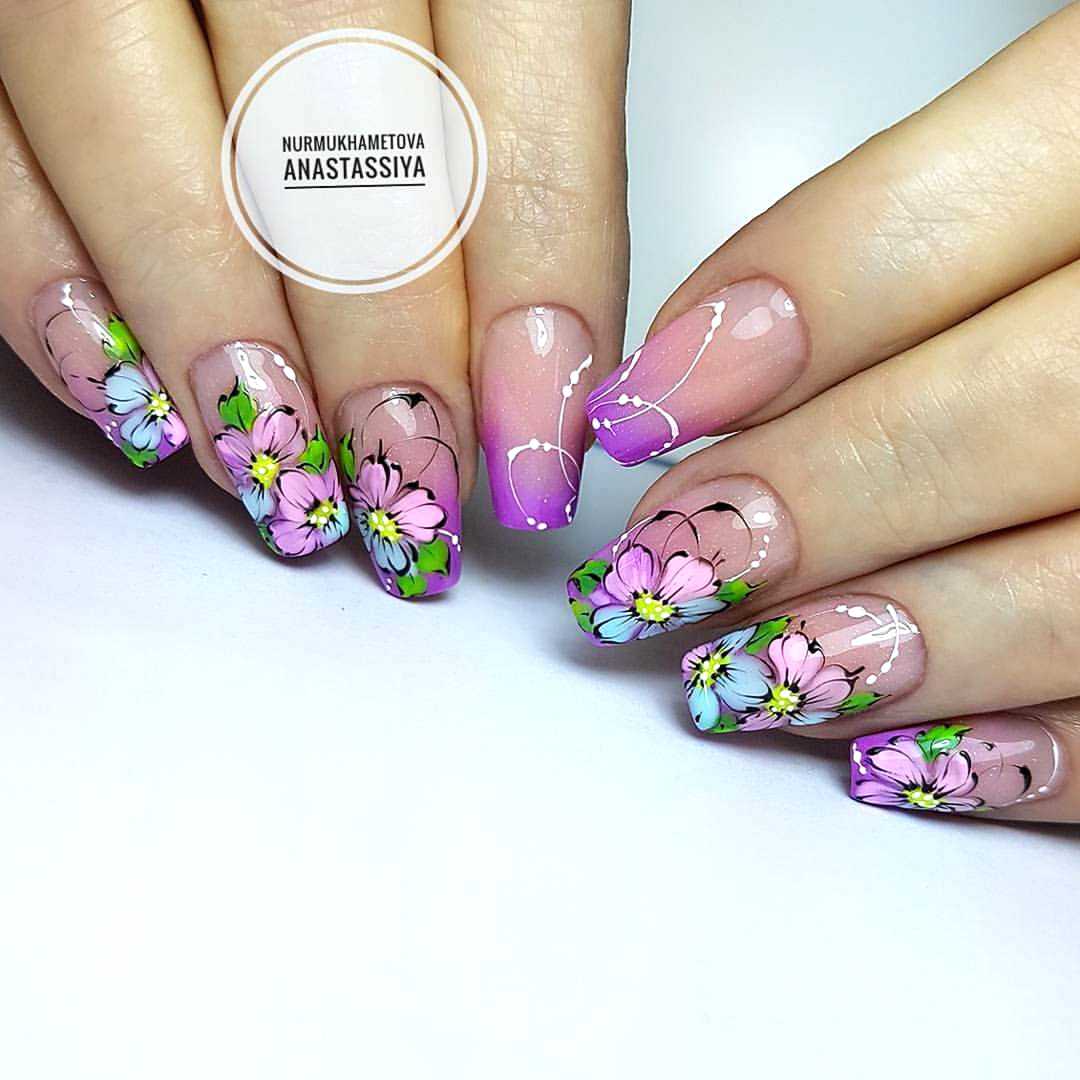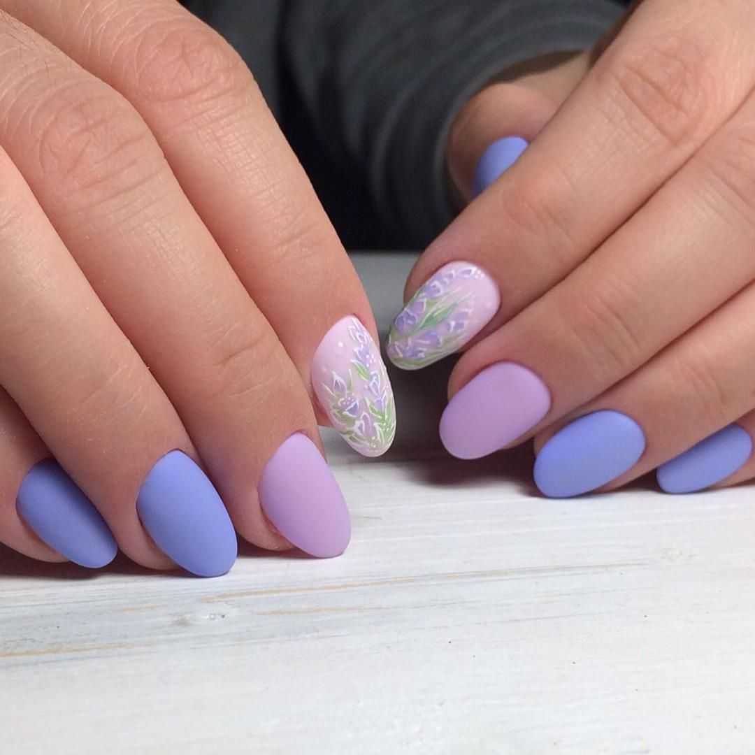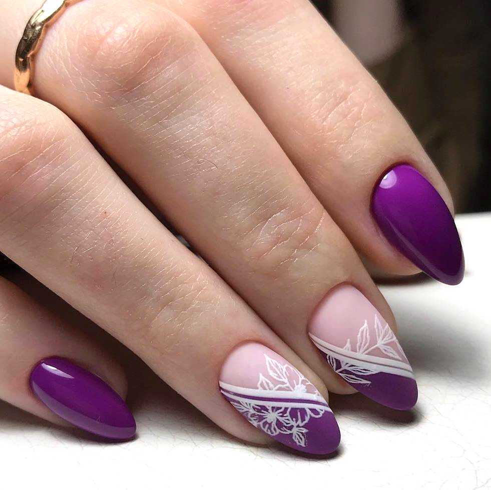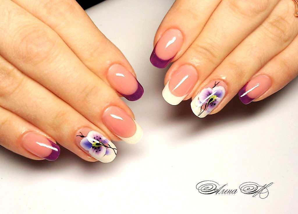 Бело-розовый тон идеален для невесты. Стильный маникюр в фиолетовой гамме пастельных оттенков подойдет для повседневного образа. Если к нему добавить крупные белые цветочные мотивы и стразы, он будет иметь торжественный вид.