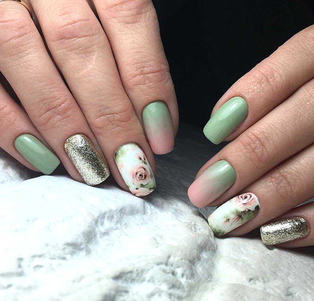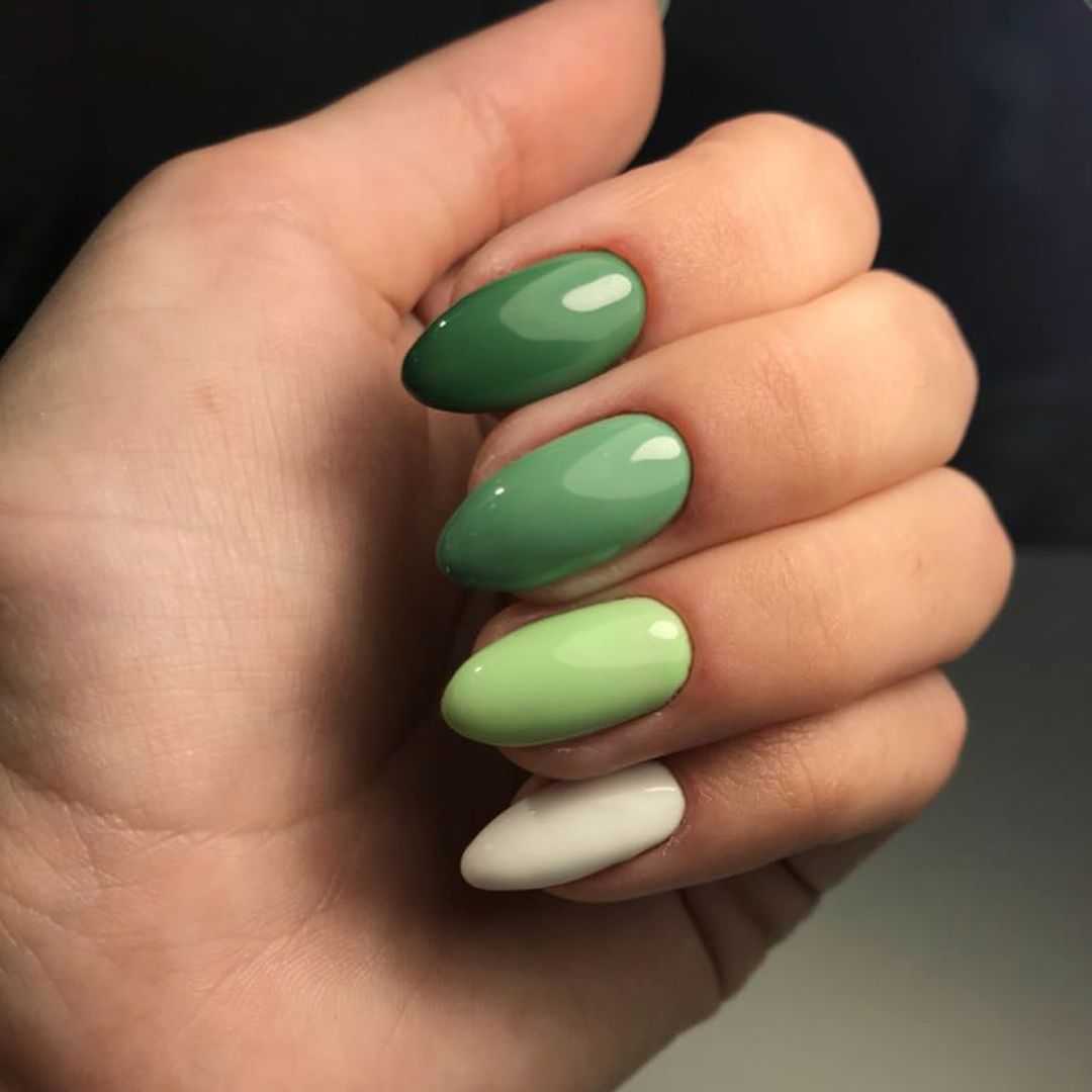 Тени. Технику стрейч-градиента можно применить и к оливково-зеленому нейл-арту. В основном здесь используются близкие друг к другу сочетания оттенков. Однако в этом дизайне допускаются более контрастные сочетания с черным и белоснежным цветами.