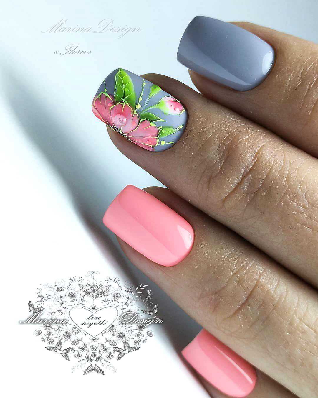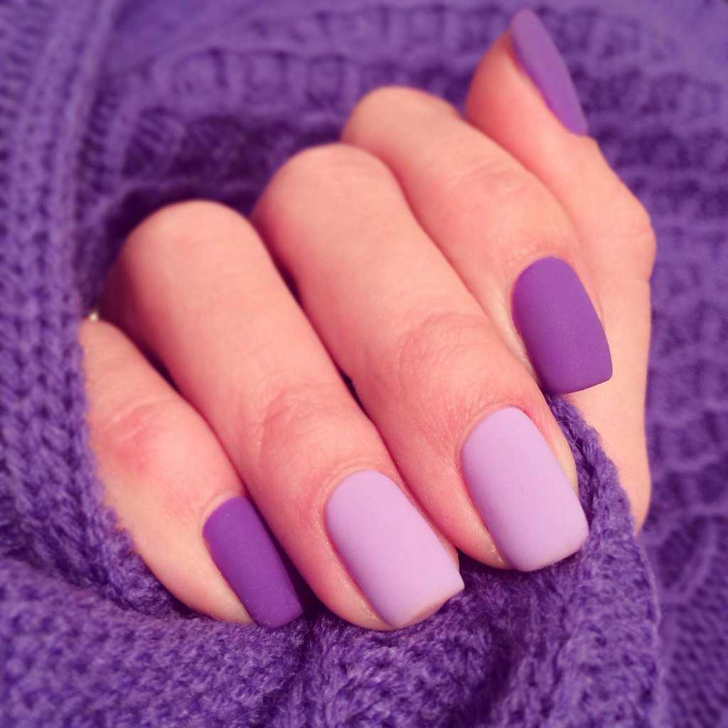Подобный вариант является самым простым и самым гармоничным в подборе сочетания лаков, и подразумевает окрашивание ноготков оттенками, относящимися к одной цветовой гамме. В этом примере покрытия отличаются между собой насыщенностью, и в результате, происходит красивое разбавление цвета другим тоном. Например, можно розовый сочетать с коралловым, винный с фиолетовым, а бирюзовый с голубым. Синий прекрасно дополняется светло-голубым, а салатовый в свою очередь синим. Такие дизайны выглядят очень нежно и гармонично на ноготках. Сочетания можно интересно оформить с использованием акриловой пудры нужного вам цвета, матового топа или плавного градиентного перехода.