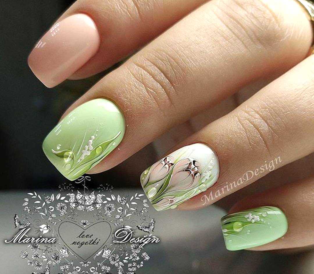 С художественной росписью. Для этого вам потребуется покрыть один-два ногтя гель-лаком молочного, бежевого или белого цвета. Именно на эти пластины и будет нанесен узор. В остальном ограничений нет и можно изобразить на ногтях как классические цветочные орнаменты, так и варианты в виде абстракции, а также тематические рисунки, посвященные конкретному событию или сезону.