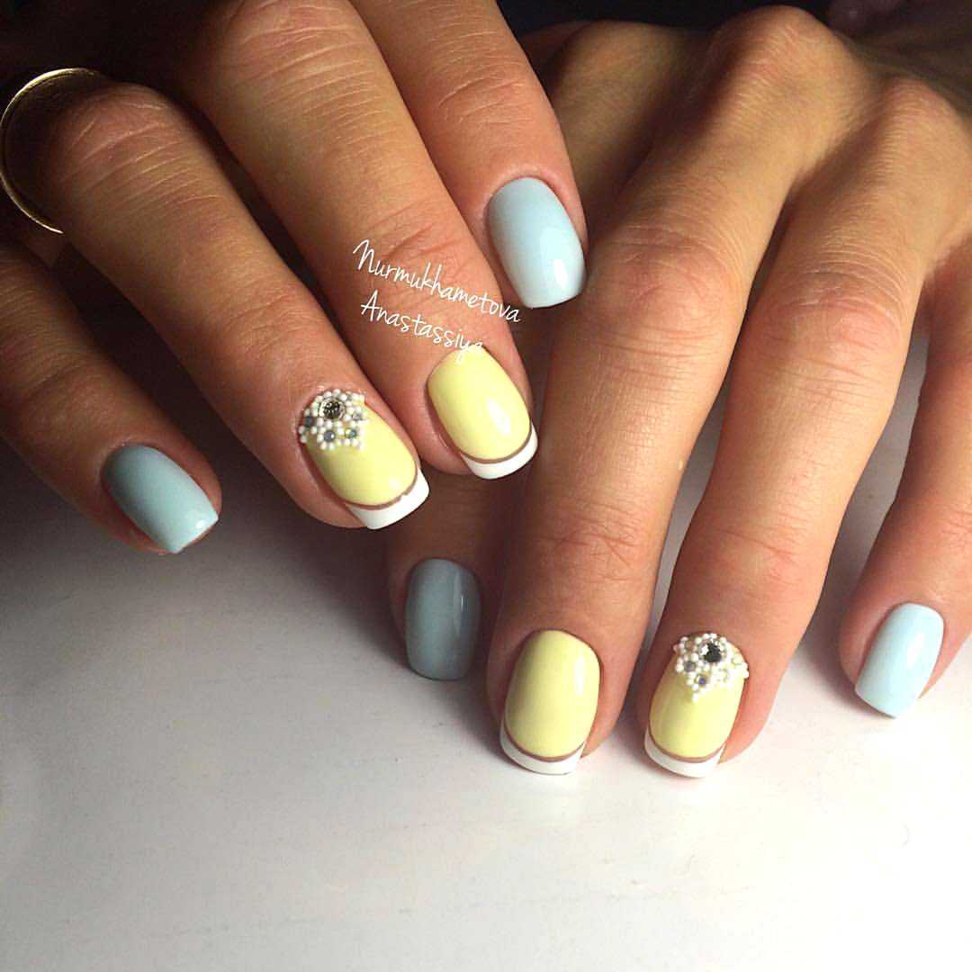 Насыщенный сине-жёлтый маникюр, декорированный стразами