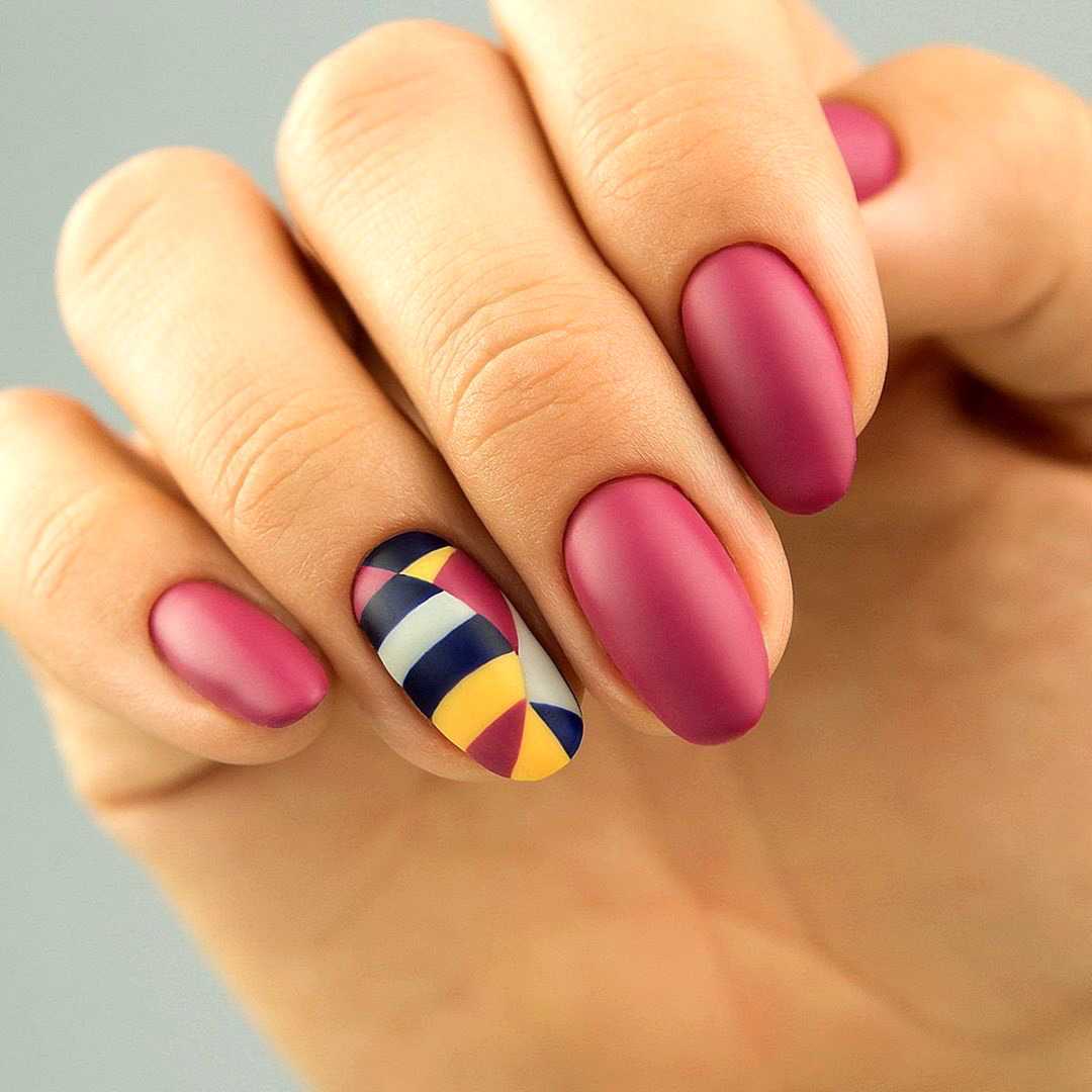 С геометрией. Еще одно модное направление современного нейл-арта – это дизайны с изображением геометрических фигур. На ногтях они могут присутствовать индивидуально и располагаться у основания или центра налета. Допустимы и более сложные дизайны, когда все искусство создано из геометрических фигур, поддерживаемых как в одной палитре, так и в разных палитрах. Стоит отметить в этих конструкциях более двух пальцев.